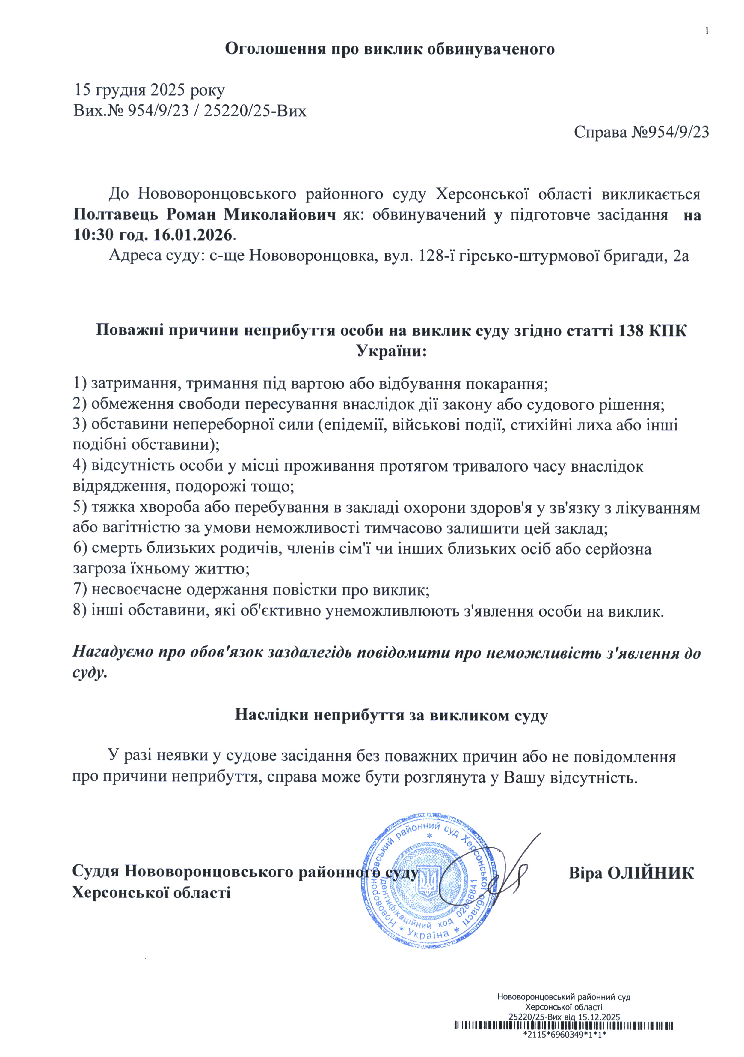 До суду викликається Полтавець Роман Миколайович на 10 год. 30 хв. 16 січня 2026 року