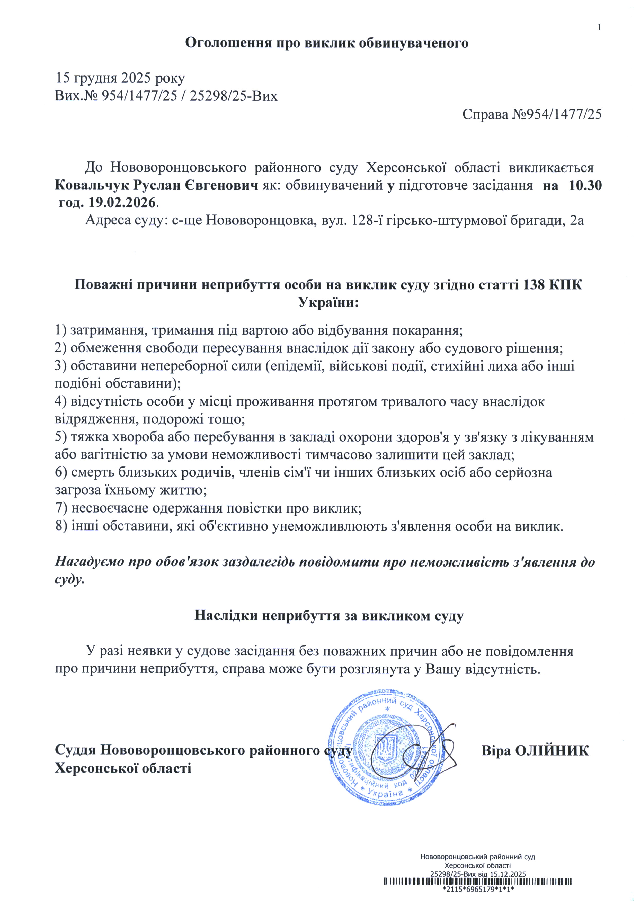 До суду викликається Ковальчук Руслан Євгенович на 10 год. 30 хв. 19 лютого 2026 року