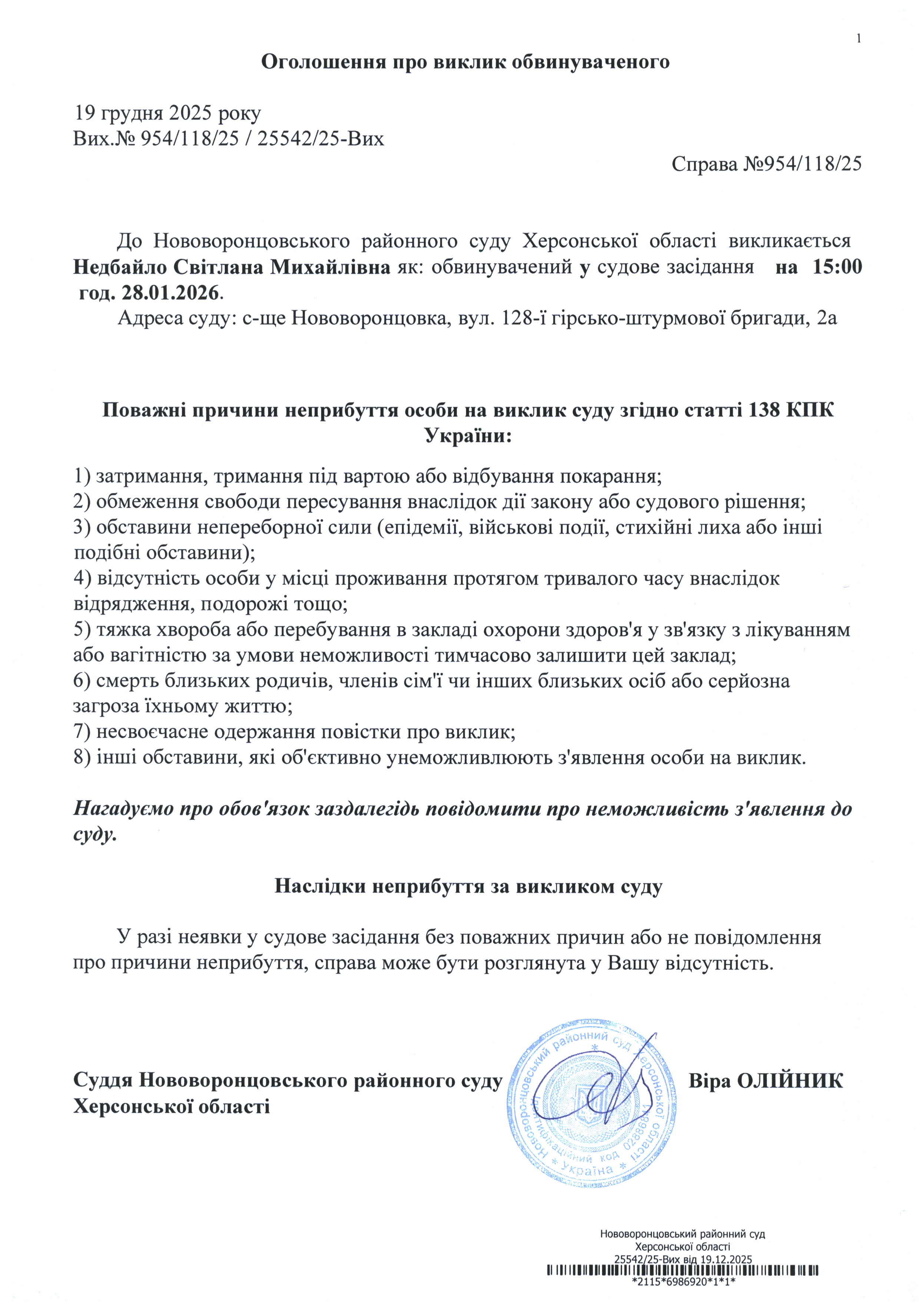 До суду викликається Недбайло Світлана Михайлівна на 15 год. 00 хв. 28 січня 2026 року