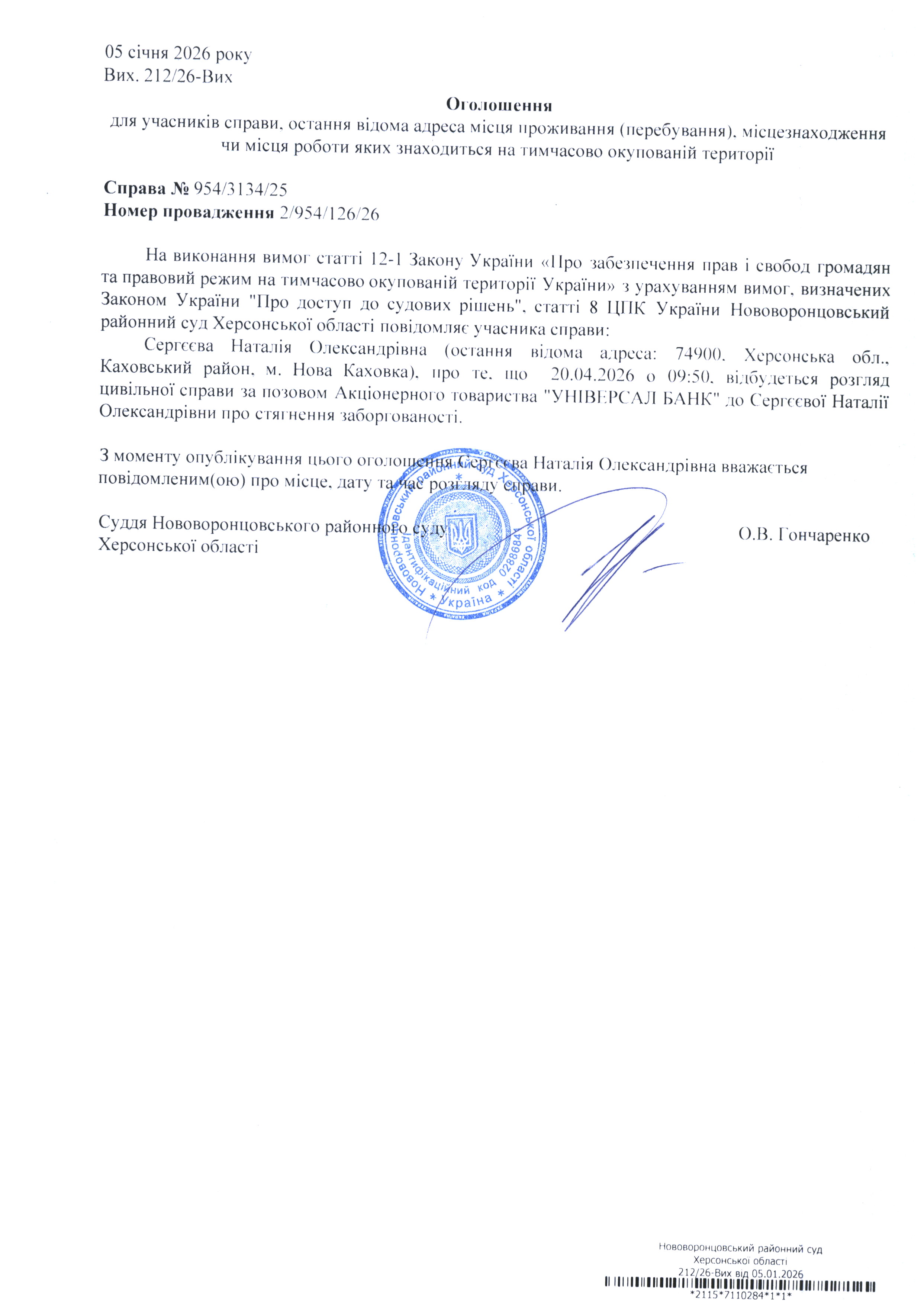 До суду викликається Сергєєва Наталія Олександрівна на 9 год. 50 хв. 20 квітня 2026 року