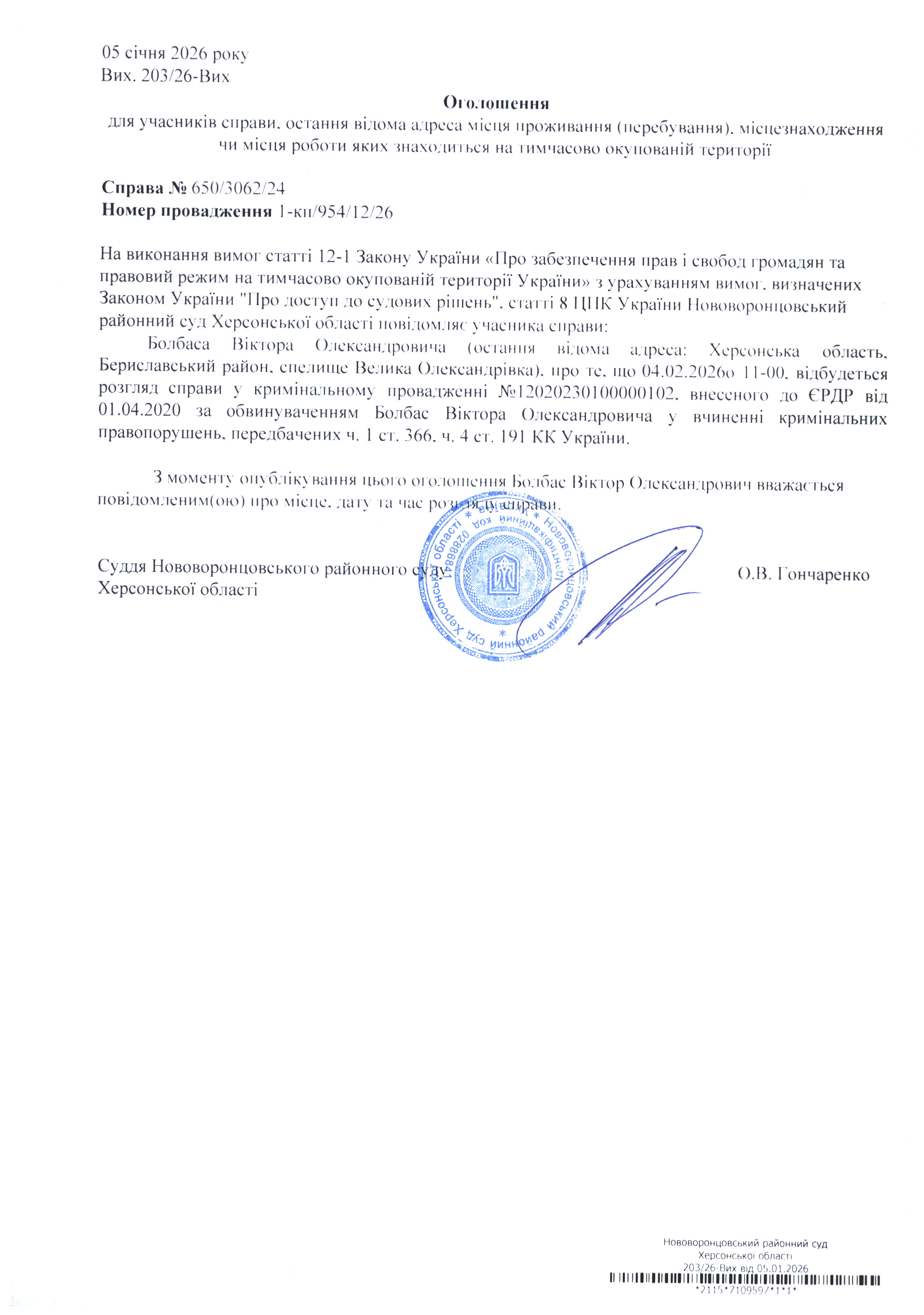 До суду викликається Болбас Віктор Олександрович на 11 год. 00 хв. 4 лютого 2026 року