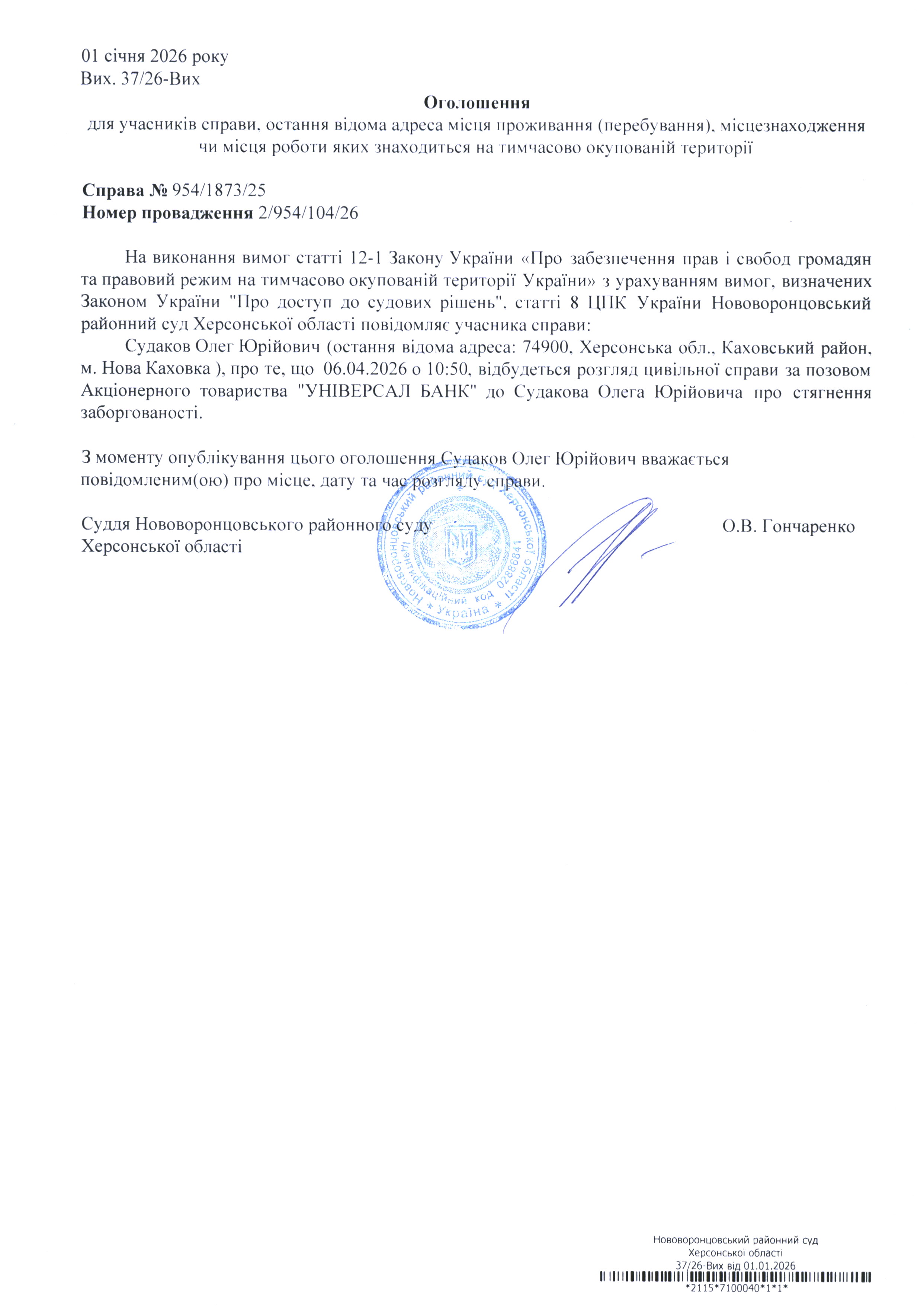 До суду викликається Судаков Олег Юрійович на 10 год. 50 хв. 6 квітня 2026 року