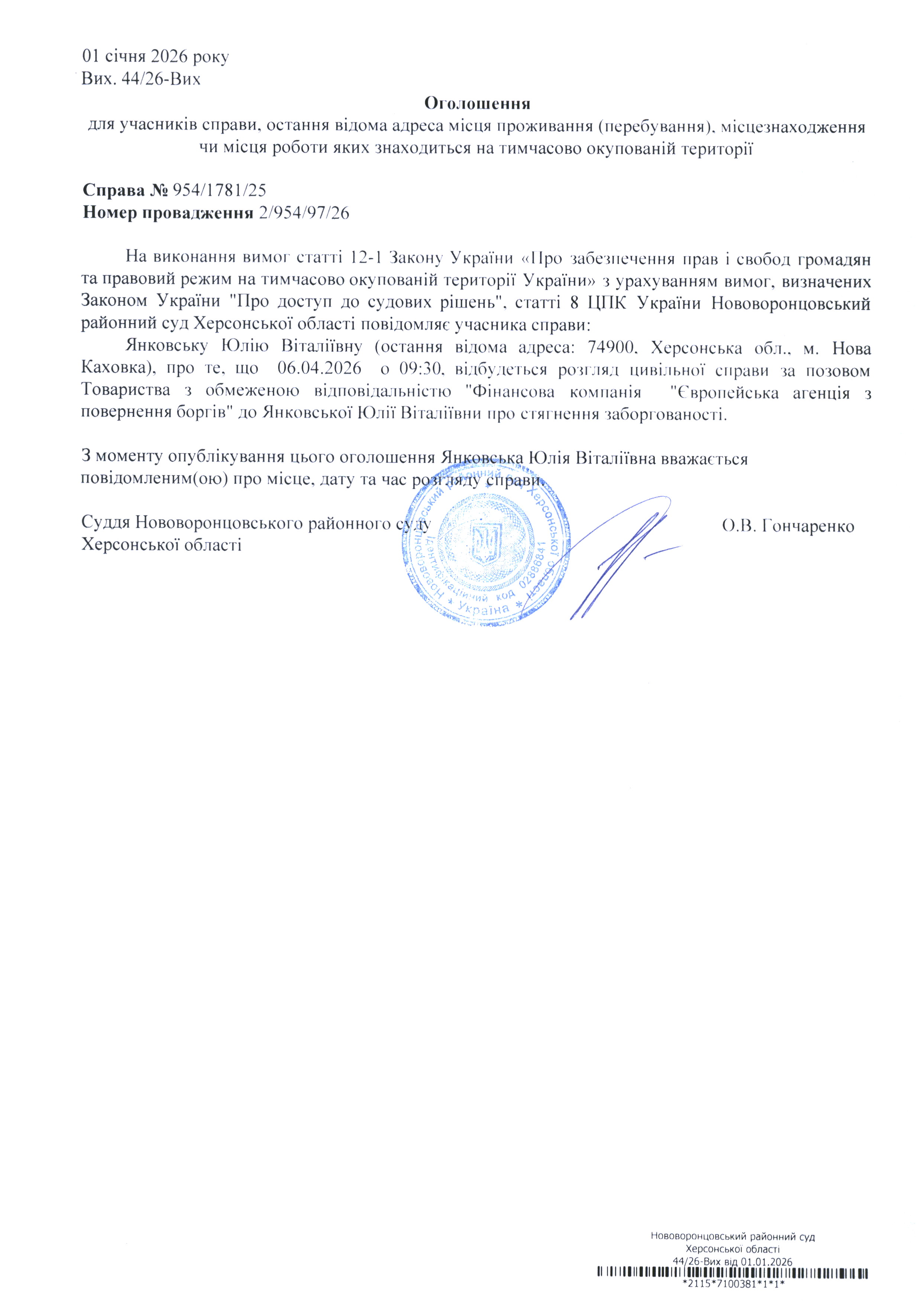 До суду викликається Янковська Юлія Віталіївна на 9 год. 30 хв. 6 квітня 2026 року