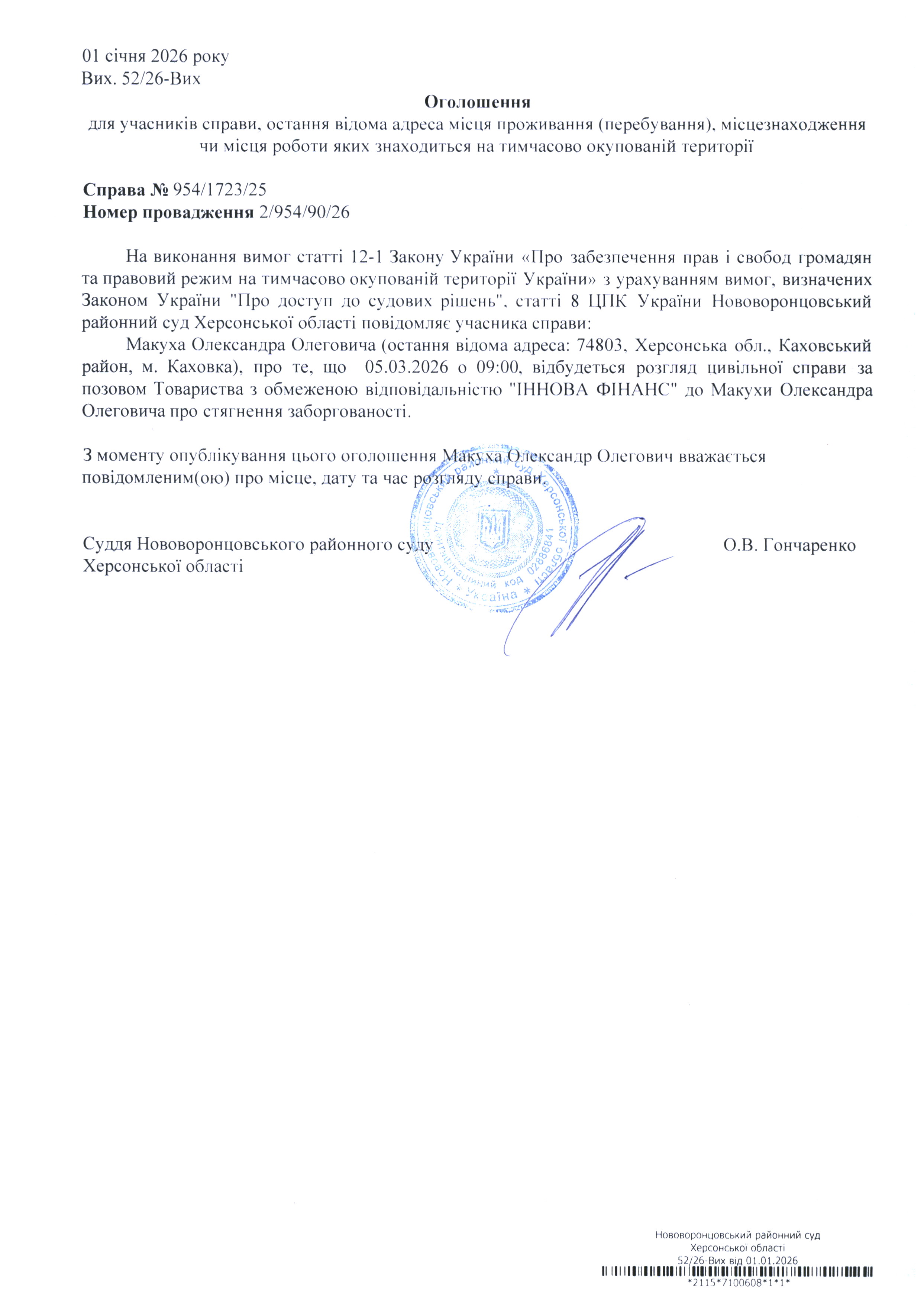 До суду викликається Макуха Олександр Олегович на 9 год. 00 хв. 5 березня 2026 року