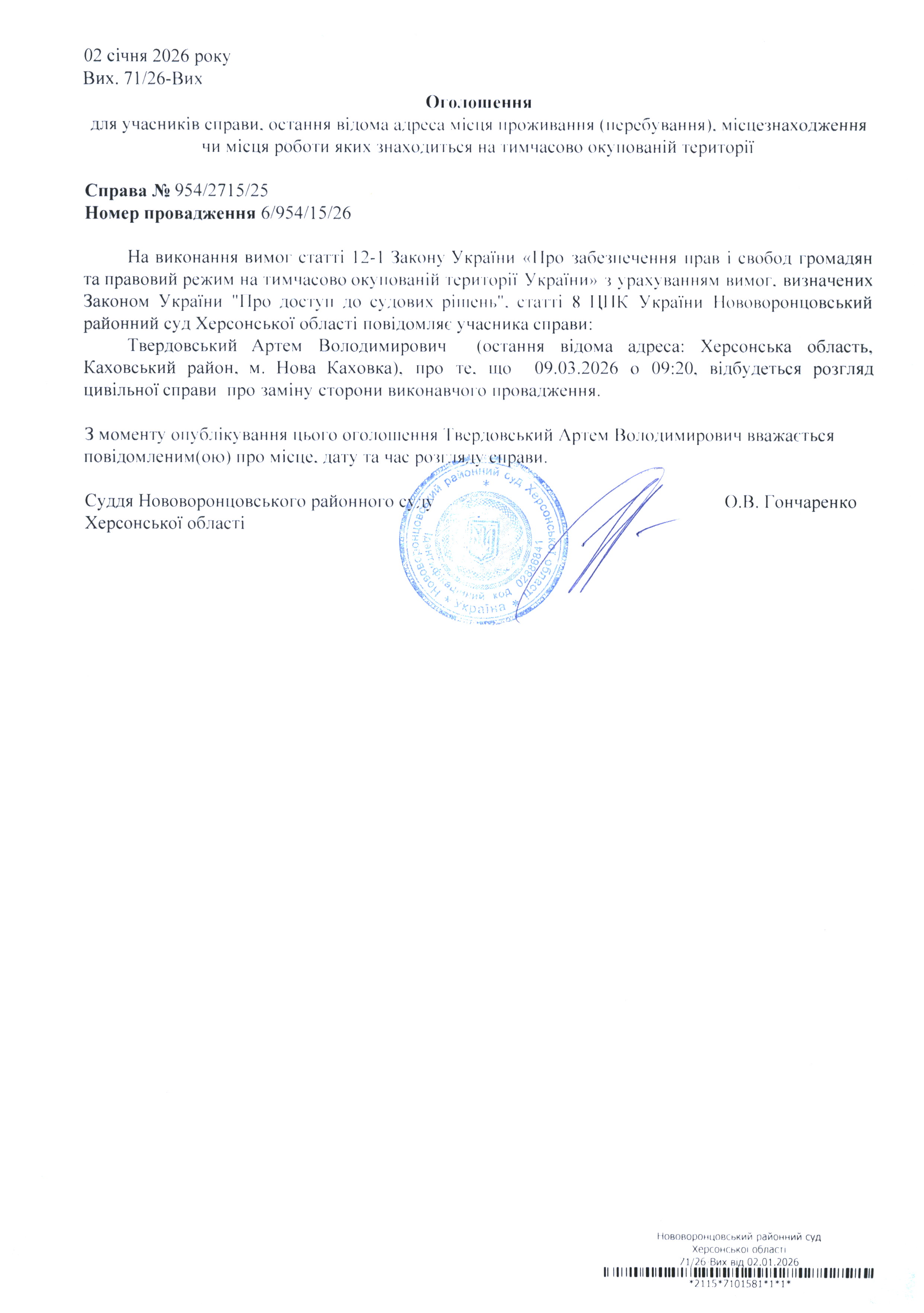 До суду викликається Твердовський Артем Володимирович на 9 год. 20 хв. 9 березня 2026 року