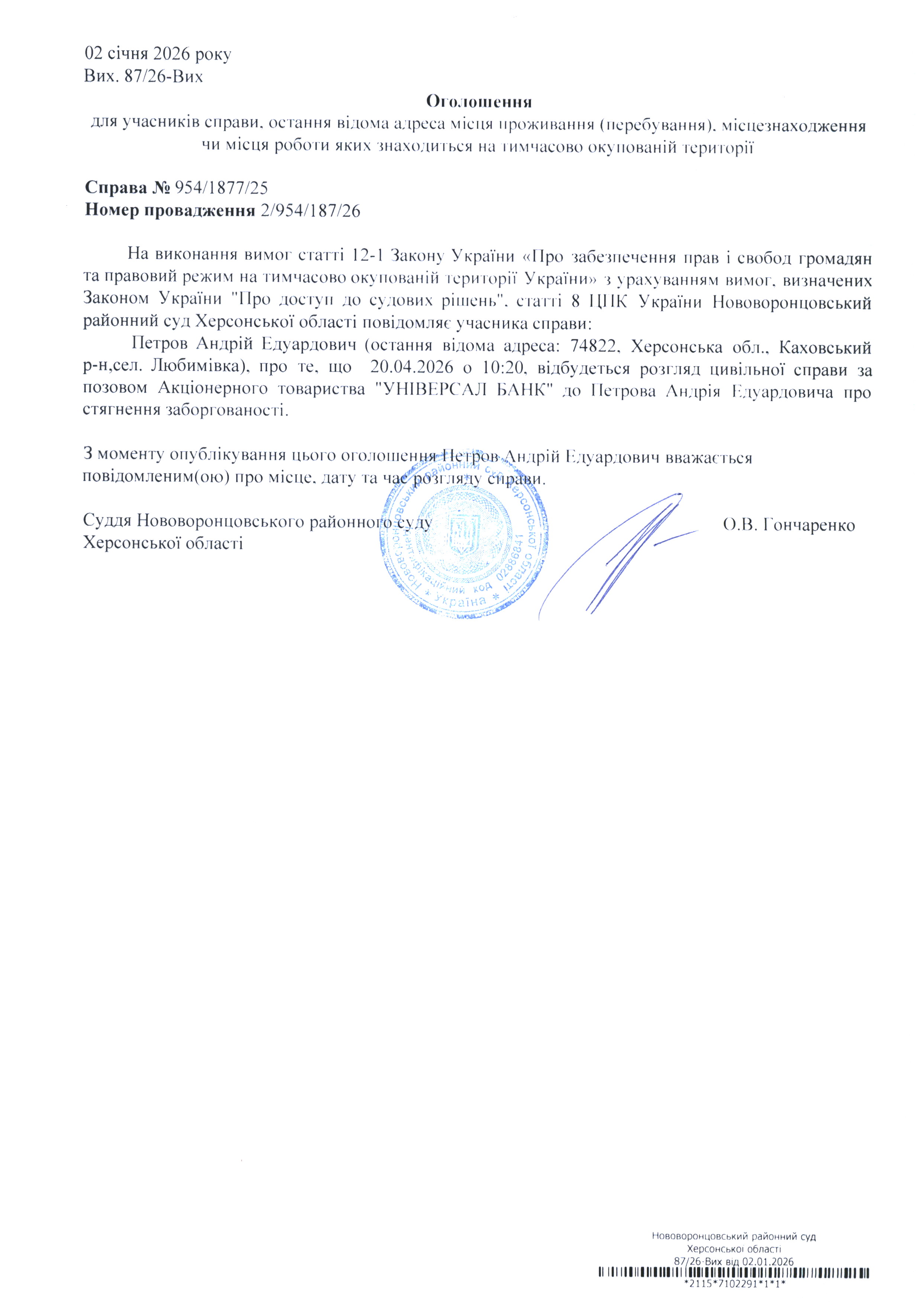До суду викликається Петров Андрій Едуардович на 10 год. 20 хв. 20 квітня 2026 року