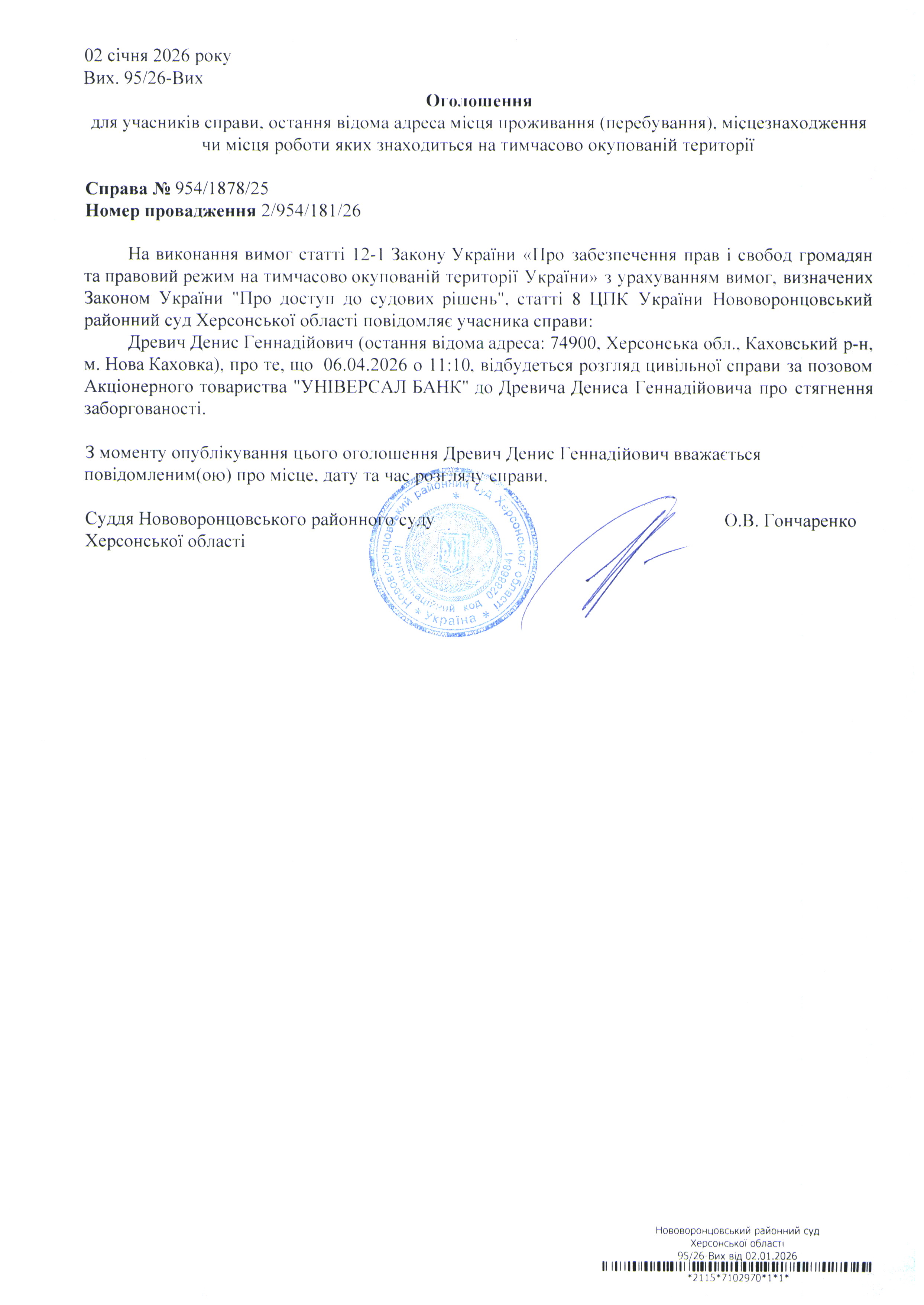 До суду викликається Древич Денис Геннадійович на 11 год. 10 хв. 6 квітня 2026 року