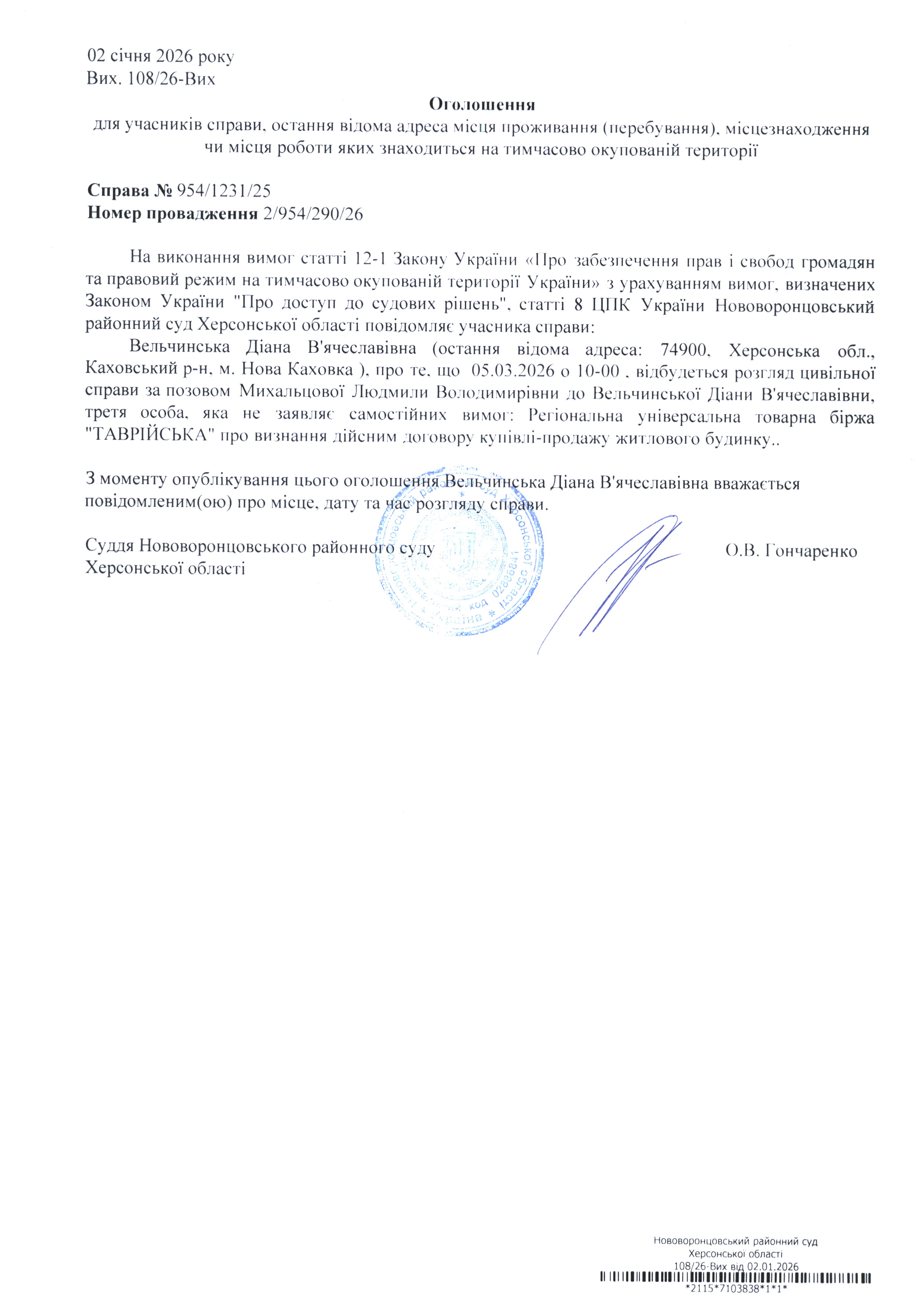 До суду викликається Вельчинська Діана В'ячеславівна на 10 год. 00 хв. 5 березня 2026 року