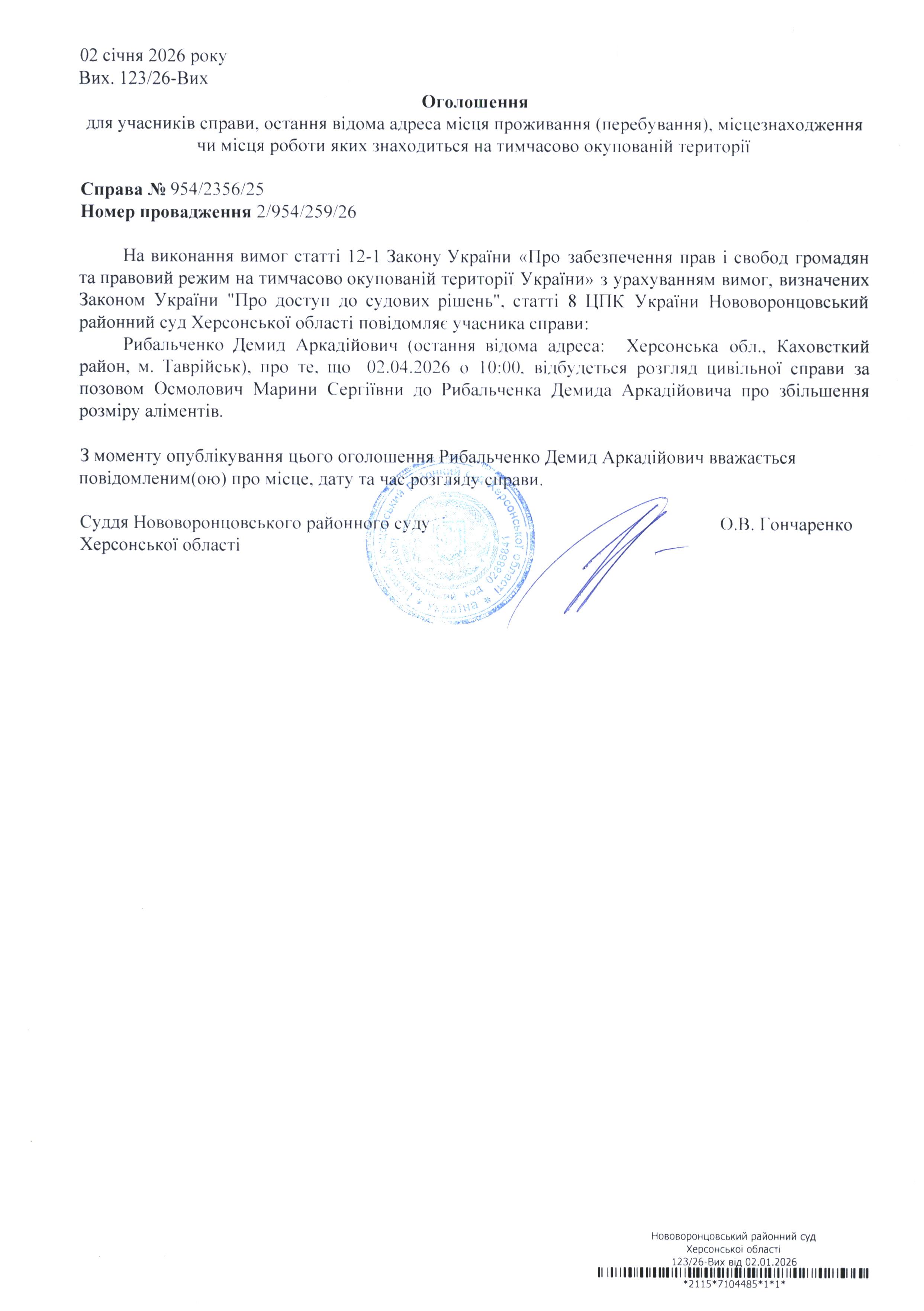 До суду викликається Рибальченко Демид Аркадійович на 10 год. 00 хв. 2 квітня 2026 року