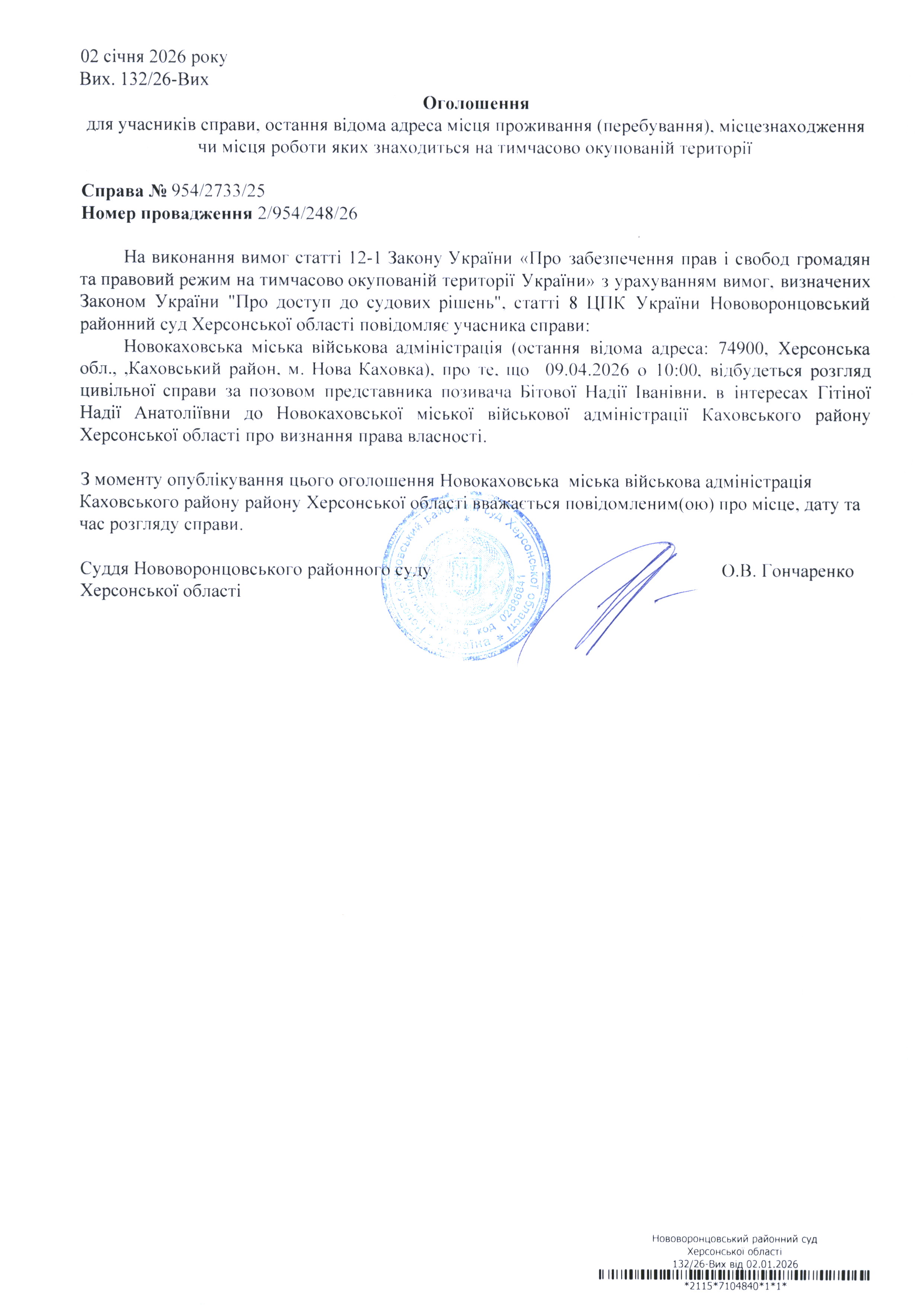 До суду викликається Новокаховська міська військова адміністрація Каховського району Херсонської області на 10 год. 00 хв. 9 квітня 2026 року