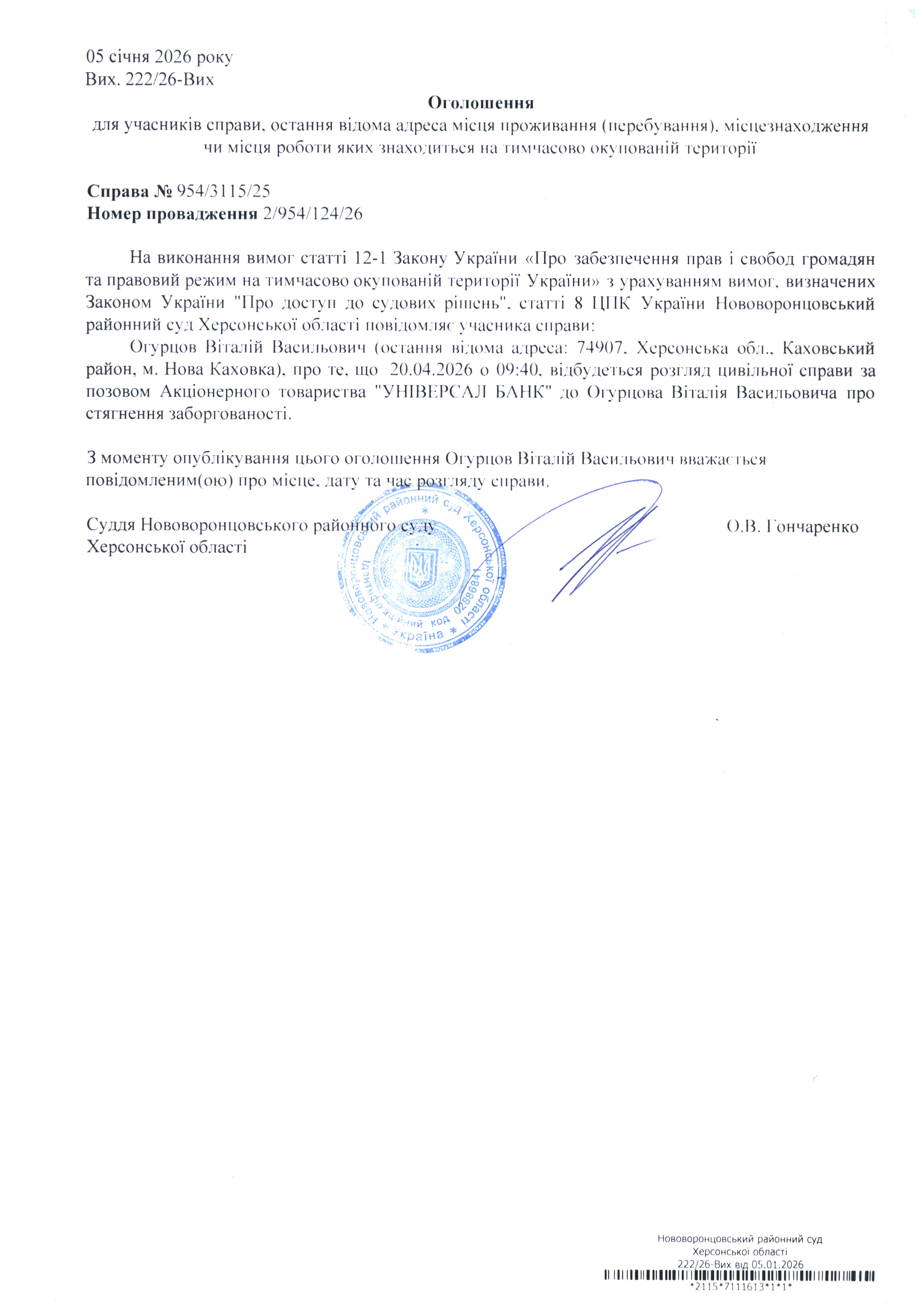 До суду викликається Огурцов Віталій Васильович на 9 год. 40 хв. 20 квітня 2026 року
