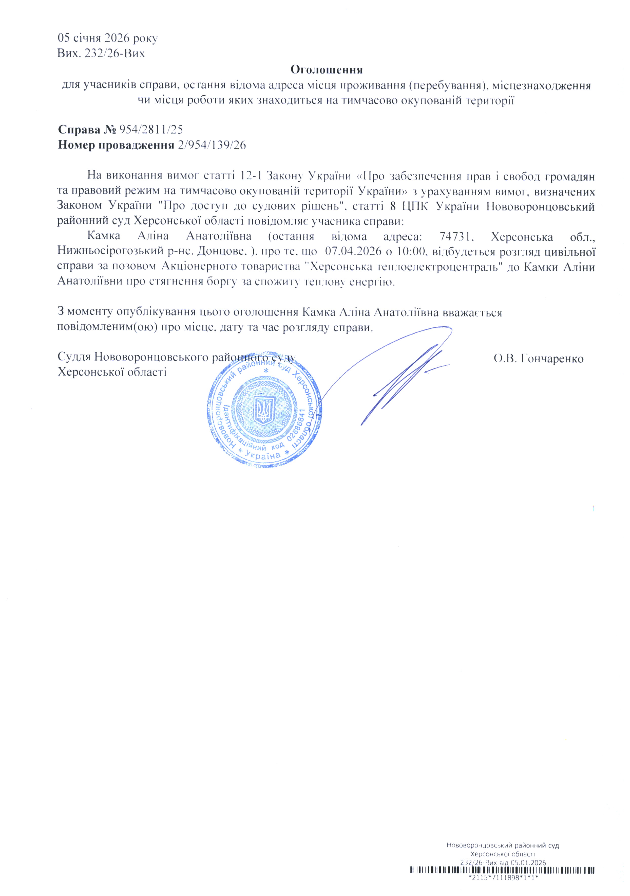 До суду викликається Камка Аліна Анатоліївна на 10 год. 00 хв. 7 квітня 2026 року