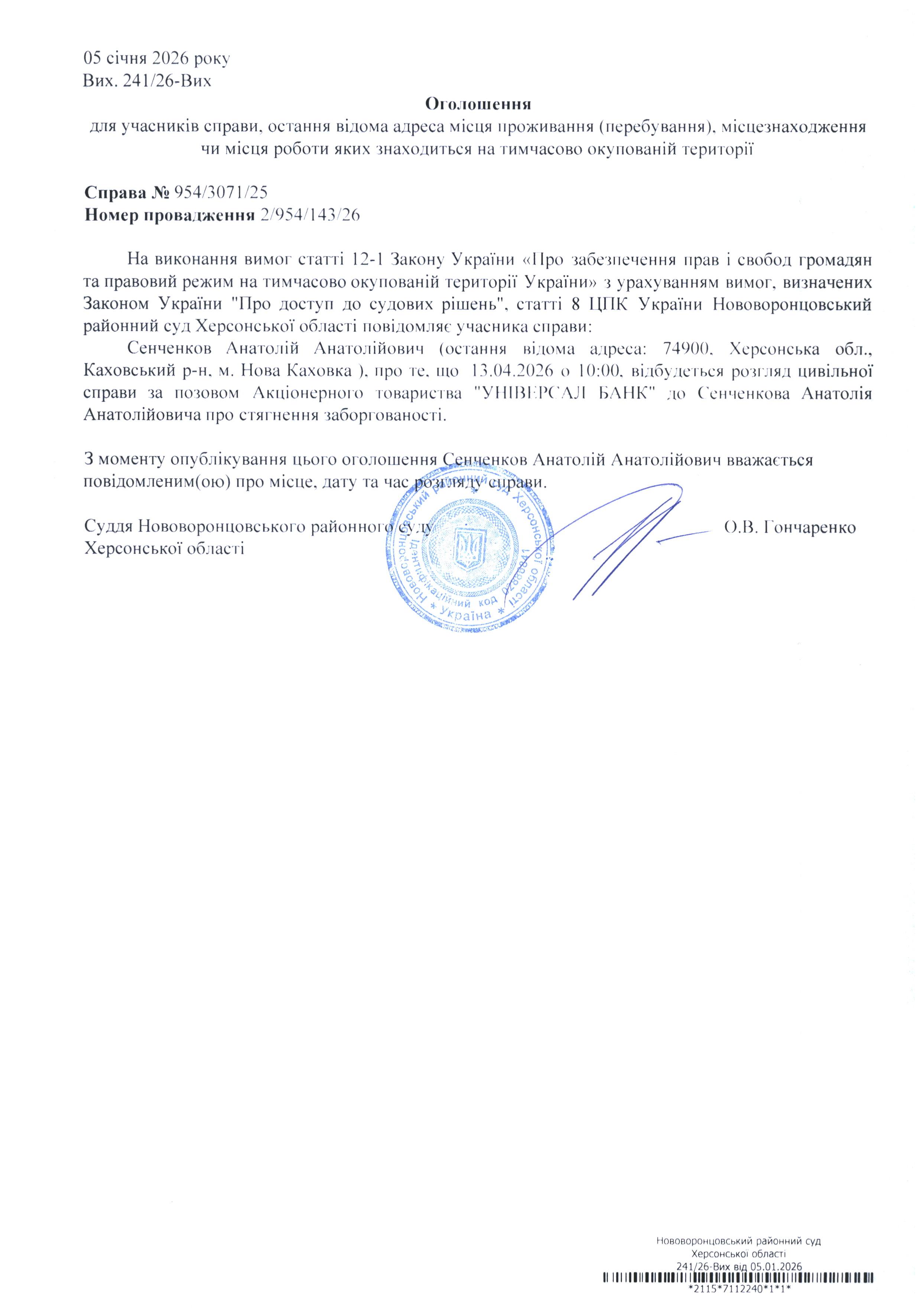 До суду викликається Сенченков Анатолій Анатолійович на 10 год. 00 хв. 13 квітня 2026 року