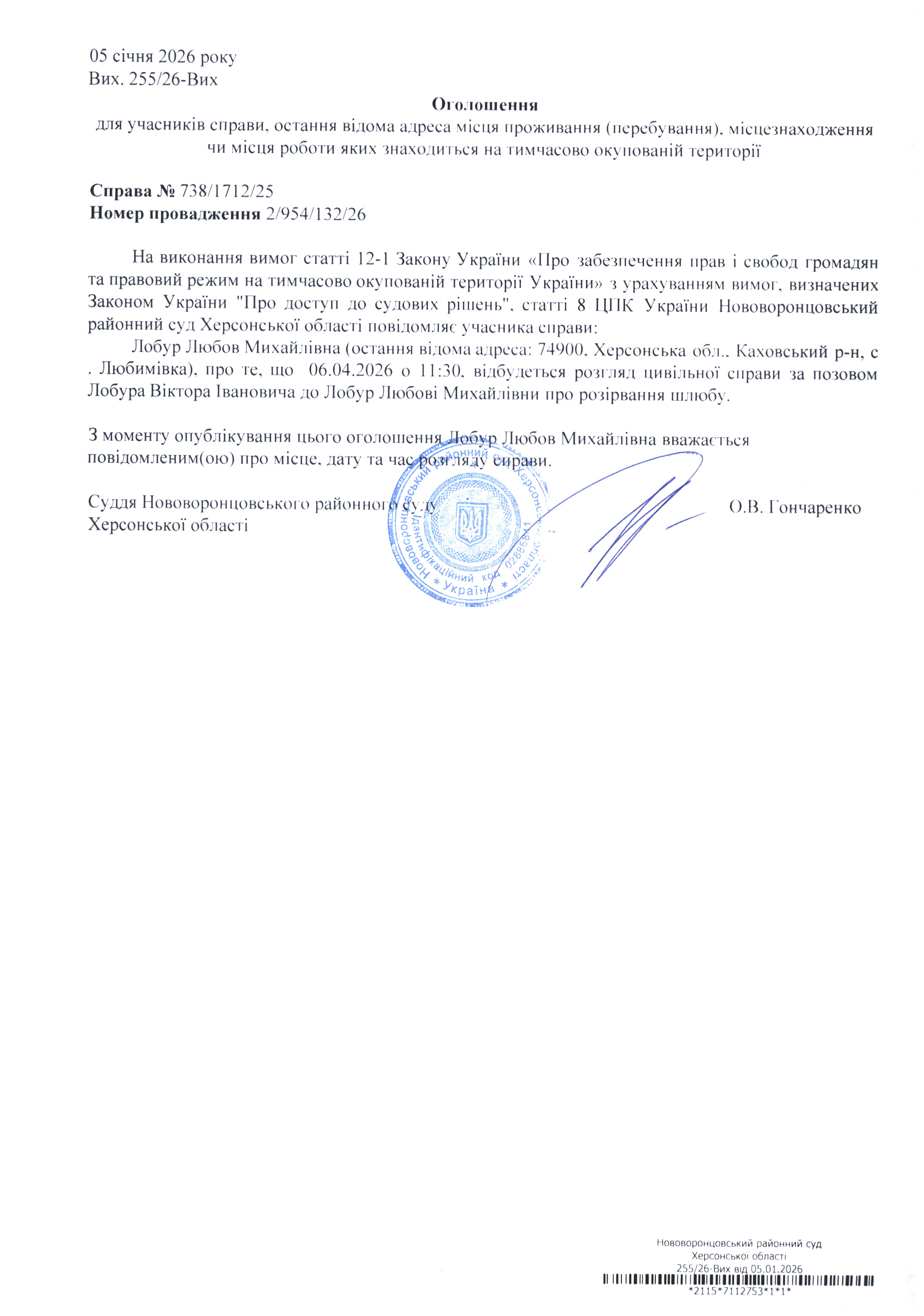 До суду викликається Лобур Любов Михайлівна на 11 год. 30 хв. 6 квітня 2026 року