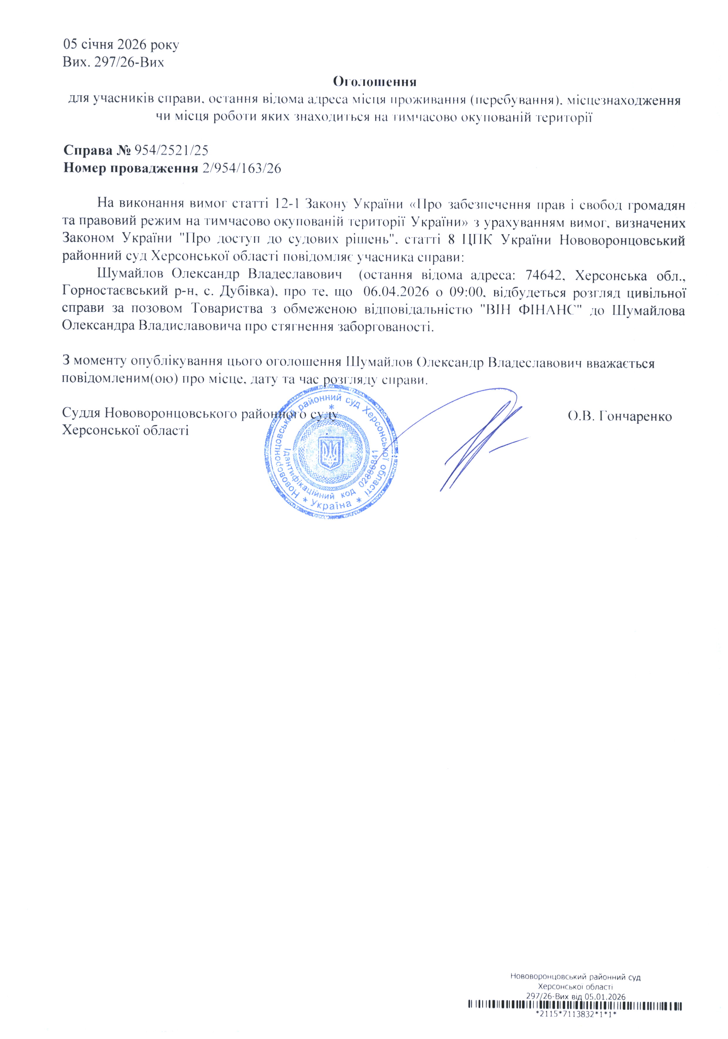 До суду викликається Шумайлов Олександр Владеславович на 9 год. 00 хв. 6 квітня 2026 року