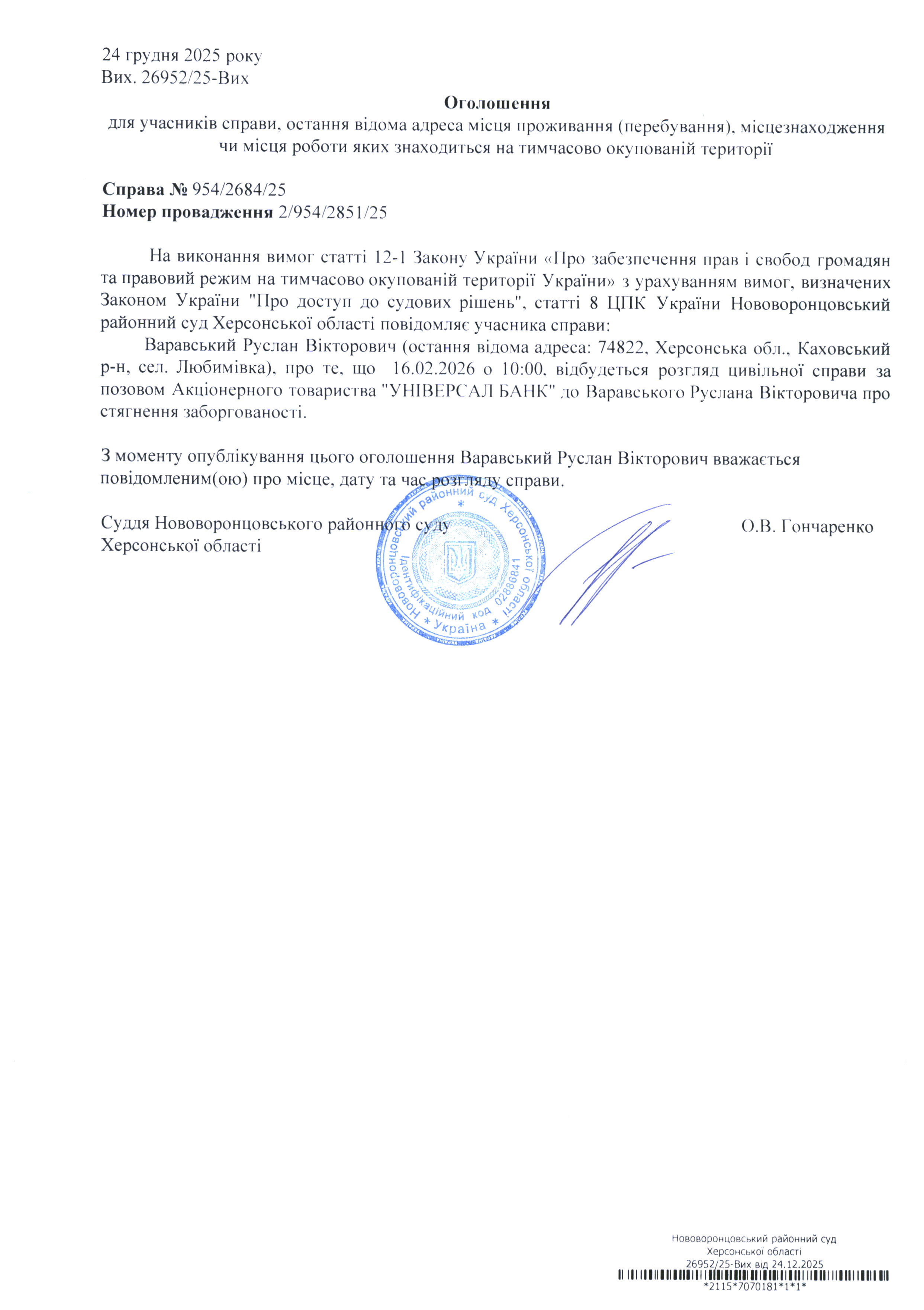 До суду викликається Варавський Руслан Вікторович на 10 год. 00 хв. 16 лютого 2026 року