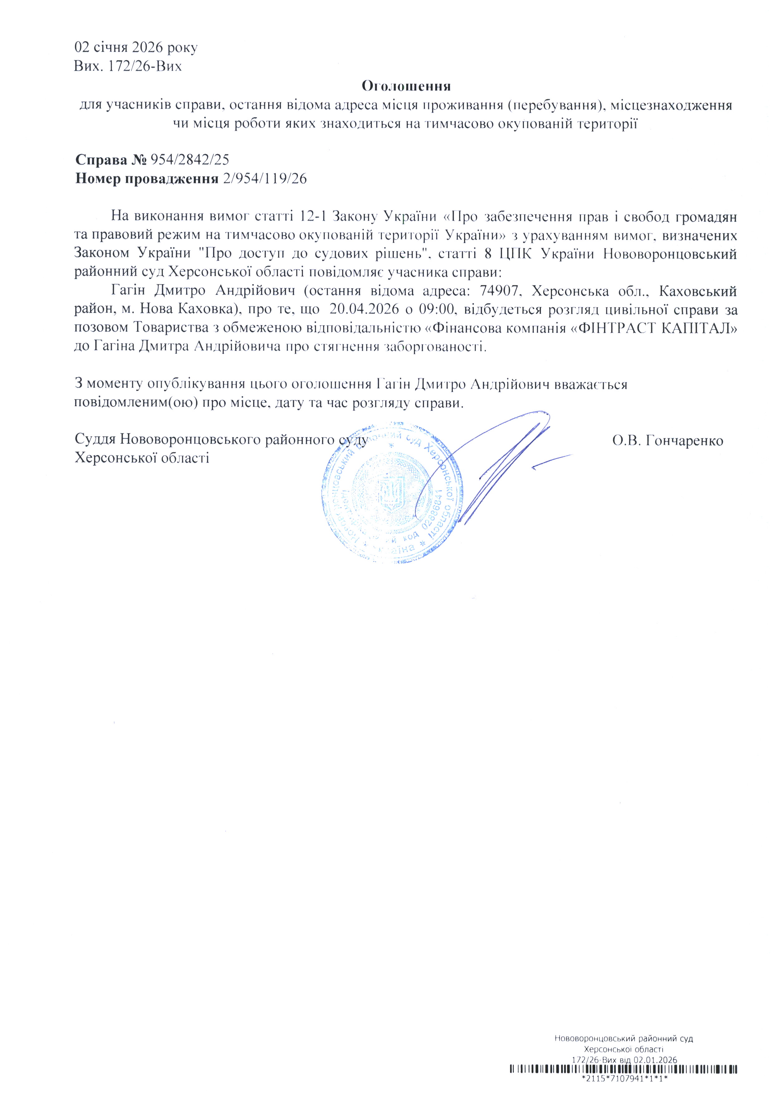 До суду викликається Гагін Дмитро Андрійович на 9 год. 00 хв. 20 квітня 2026 року
