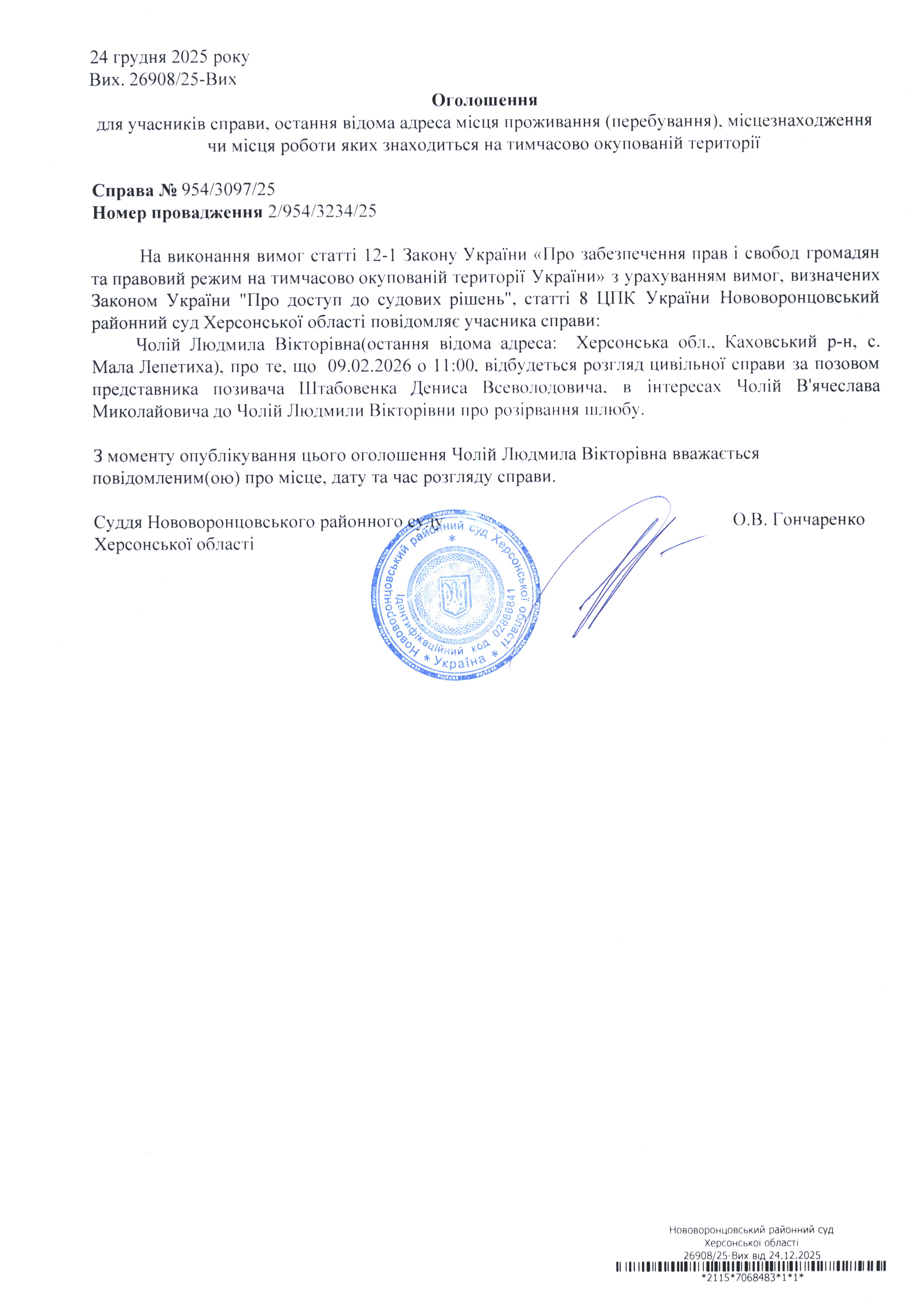 До суду викликається Чолій Людмила Вікторівна на 11 год. 00 хв. 9 лютого 2026 року