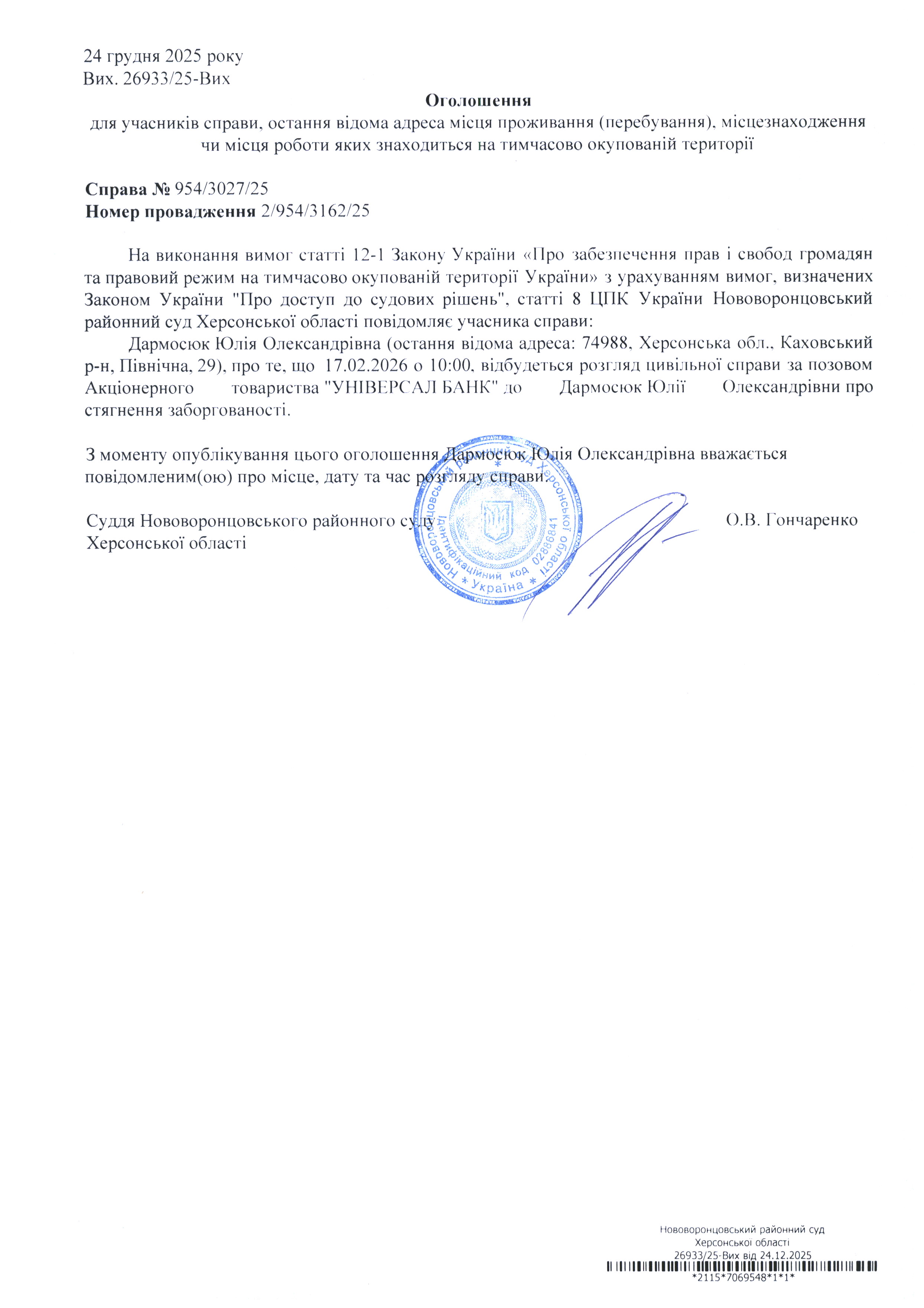 До суду викликається Дармосюк Юлія Олександрівна на 10 год. 00 хв. 17 лютого 2026 року