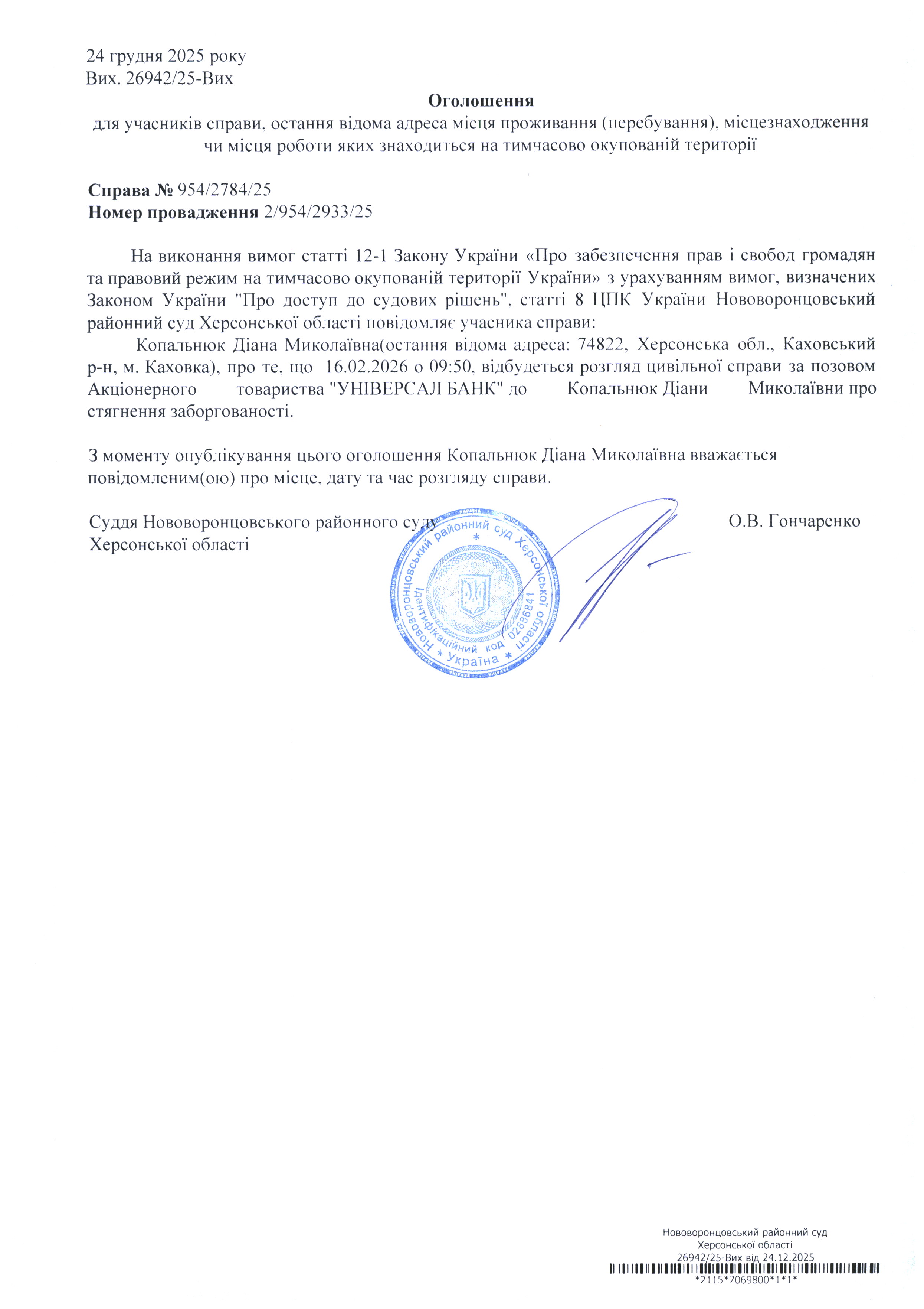 До суду викликається Копальнюк Діана Миколаївна на 9 год. 50 хв. 16 лютого 2026 року