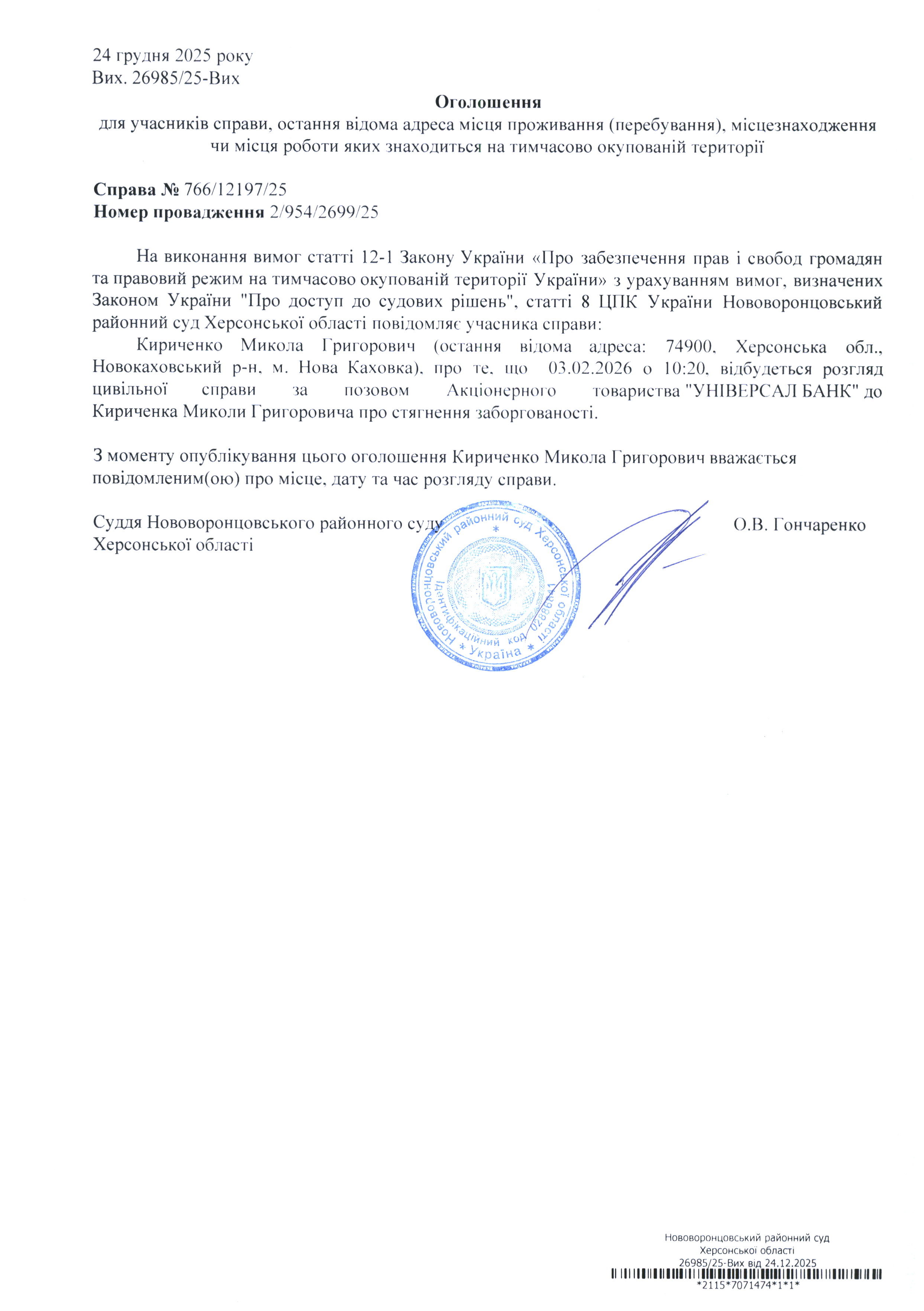 До суду викликається Кириченко Микола Григорович на 10 год. 20 хв. 3 лютого 2026 року