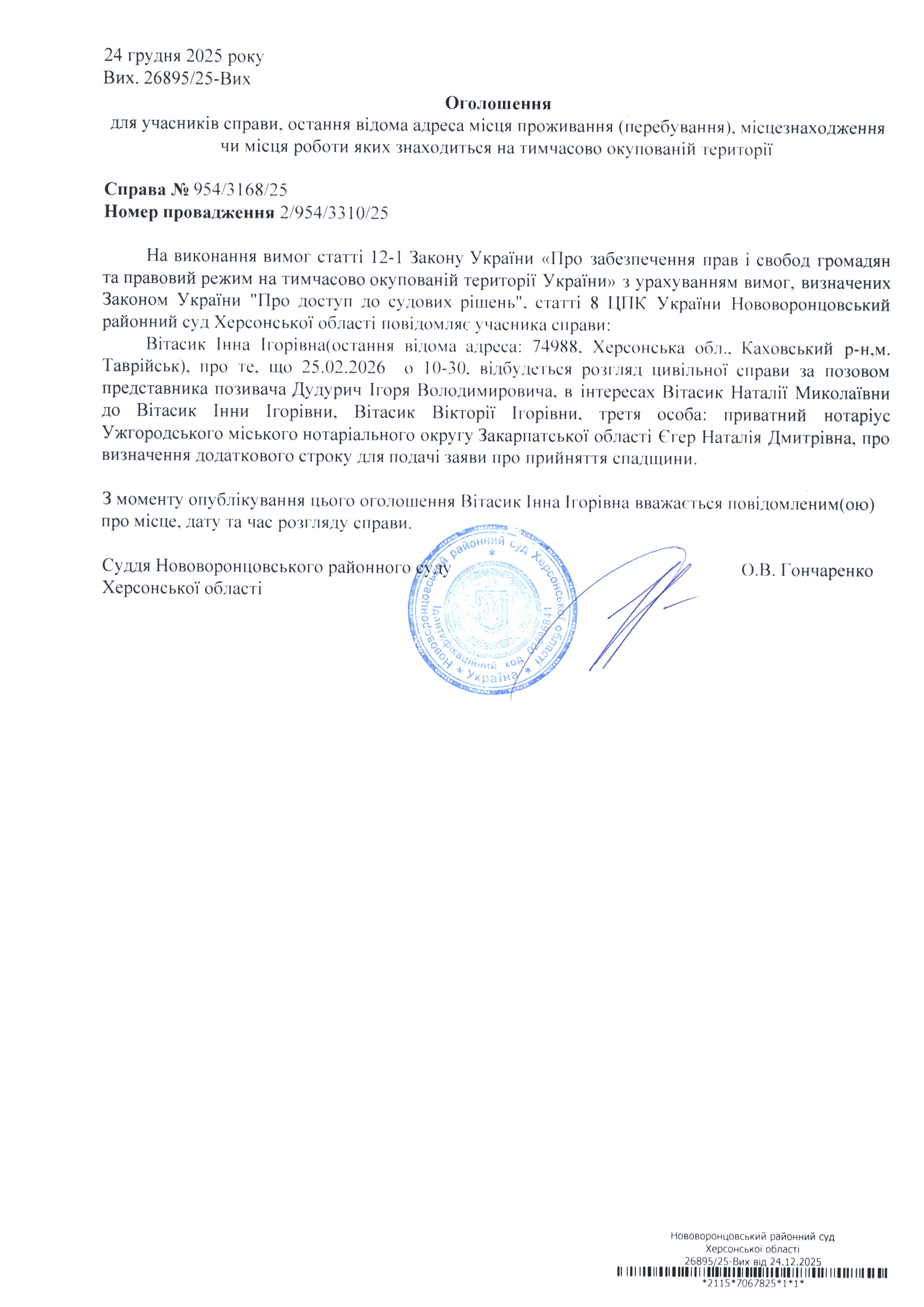 До суду викликається Вітасик Інна Ігорівна на 10 год. 30 хв. 25 лютого 2026 року
