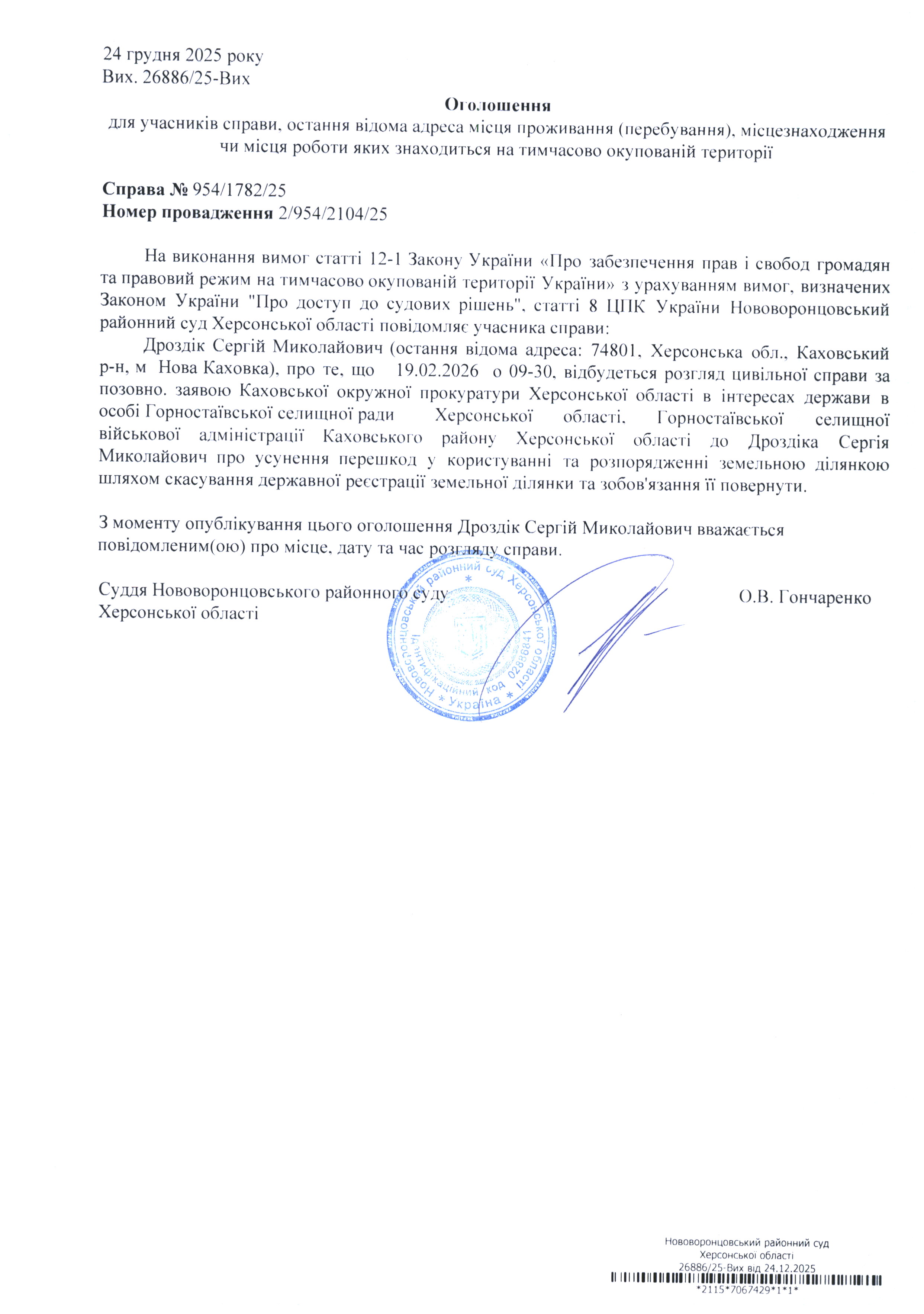 До суду викликається Дроздік Сергій Миколайович на 9 год. 30 хв. 19 лютого 2026 року