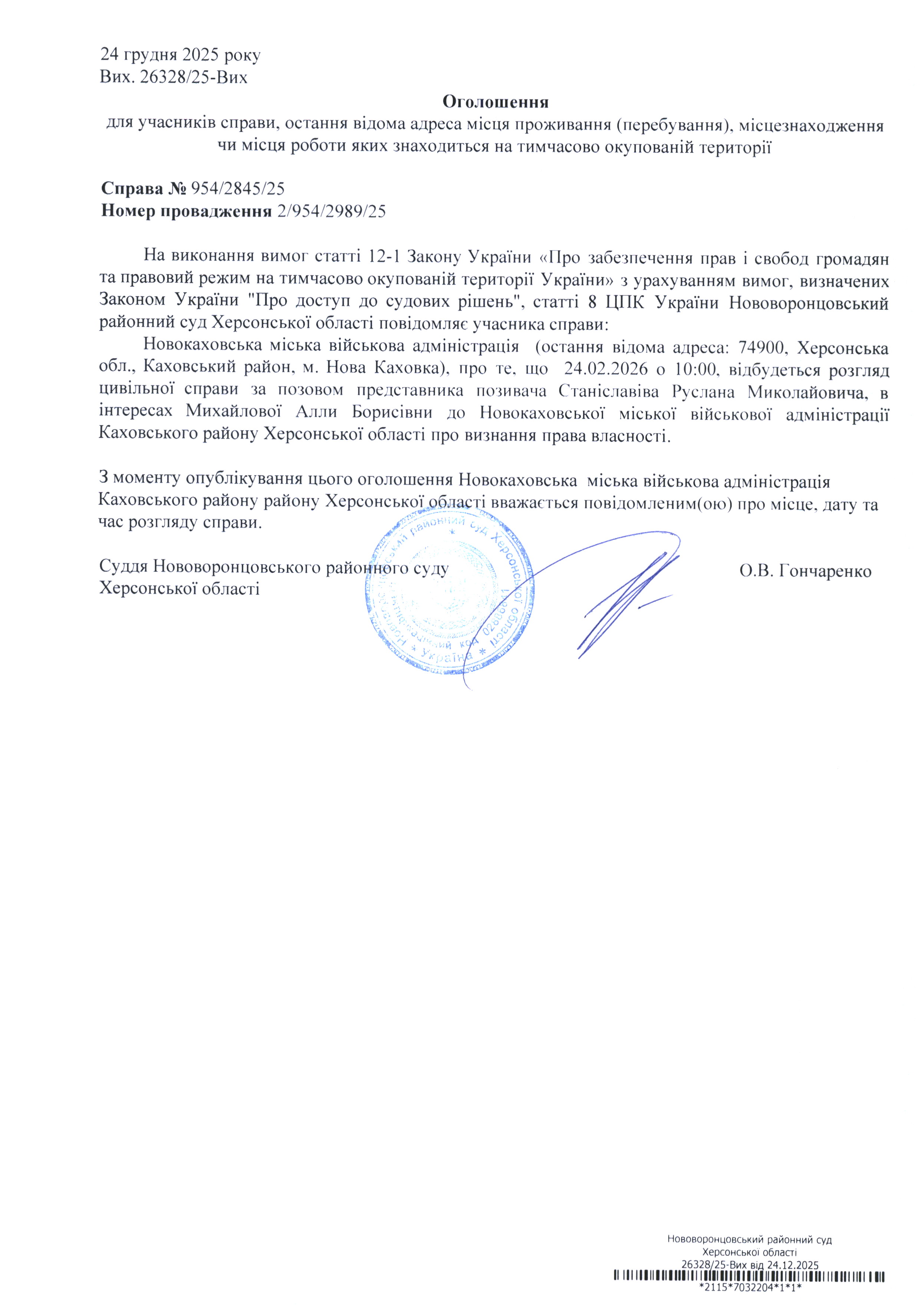 До суду викликається Новокаховська міська військова адміністрація на 10 год. 00 хв. 24 лютого 2026 року