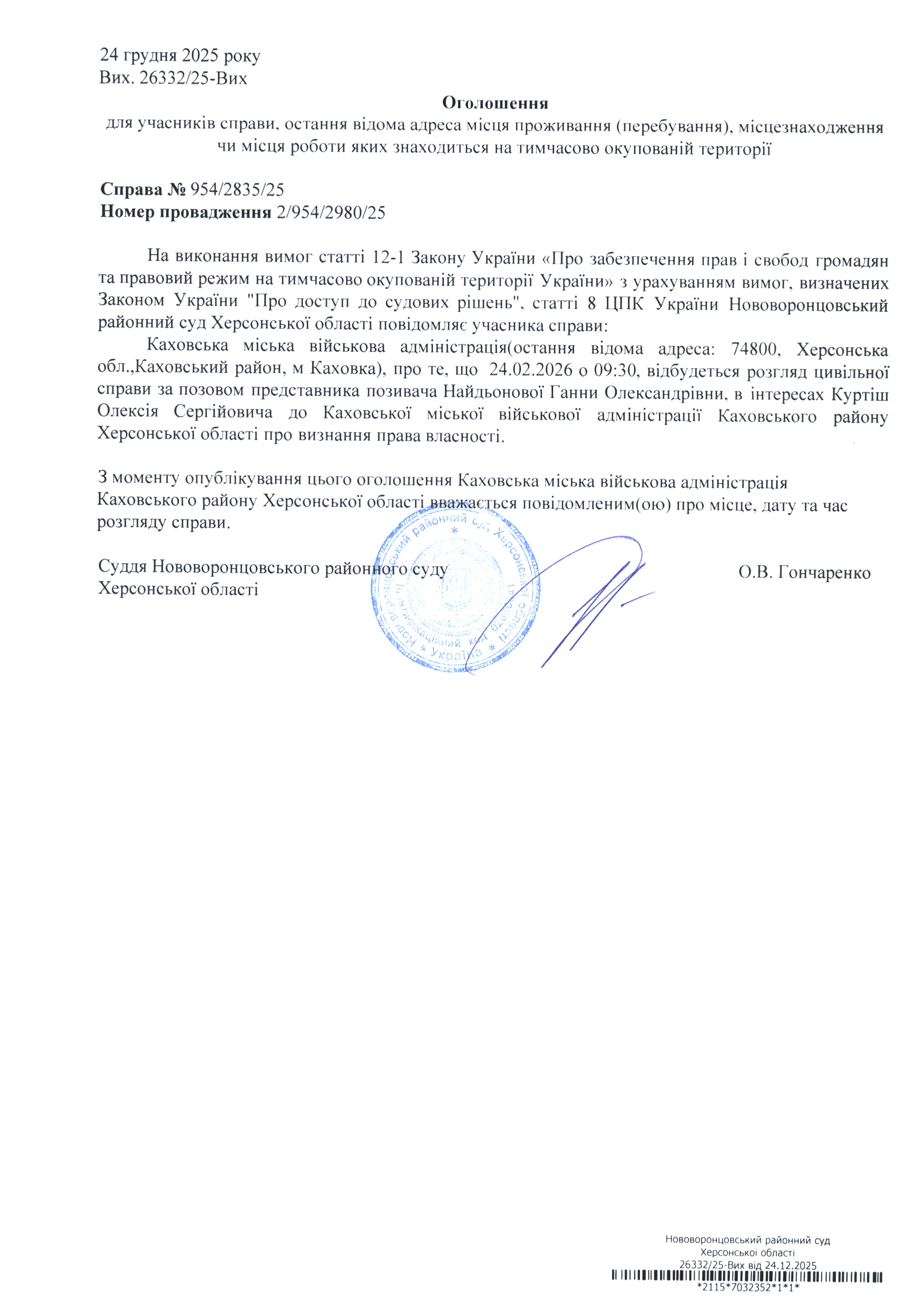 До суду викликається Каховська міська військова адміністрація на 9 год. 30 хв. 24 лютого 2026 року