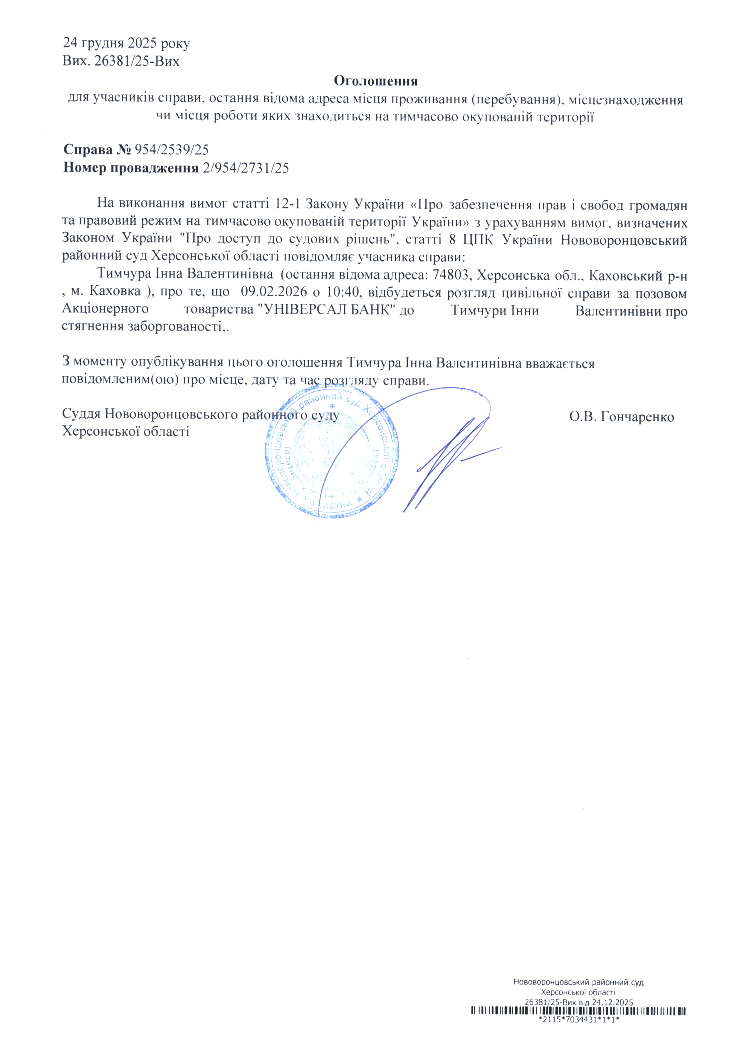 До суду викликається Тимчура Інна Валентинівна на 10 год. 40 хв. 9 лютого 2026 року