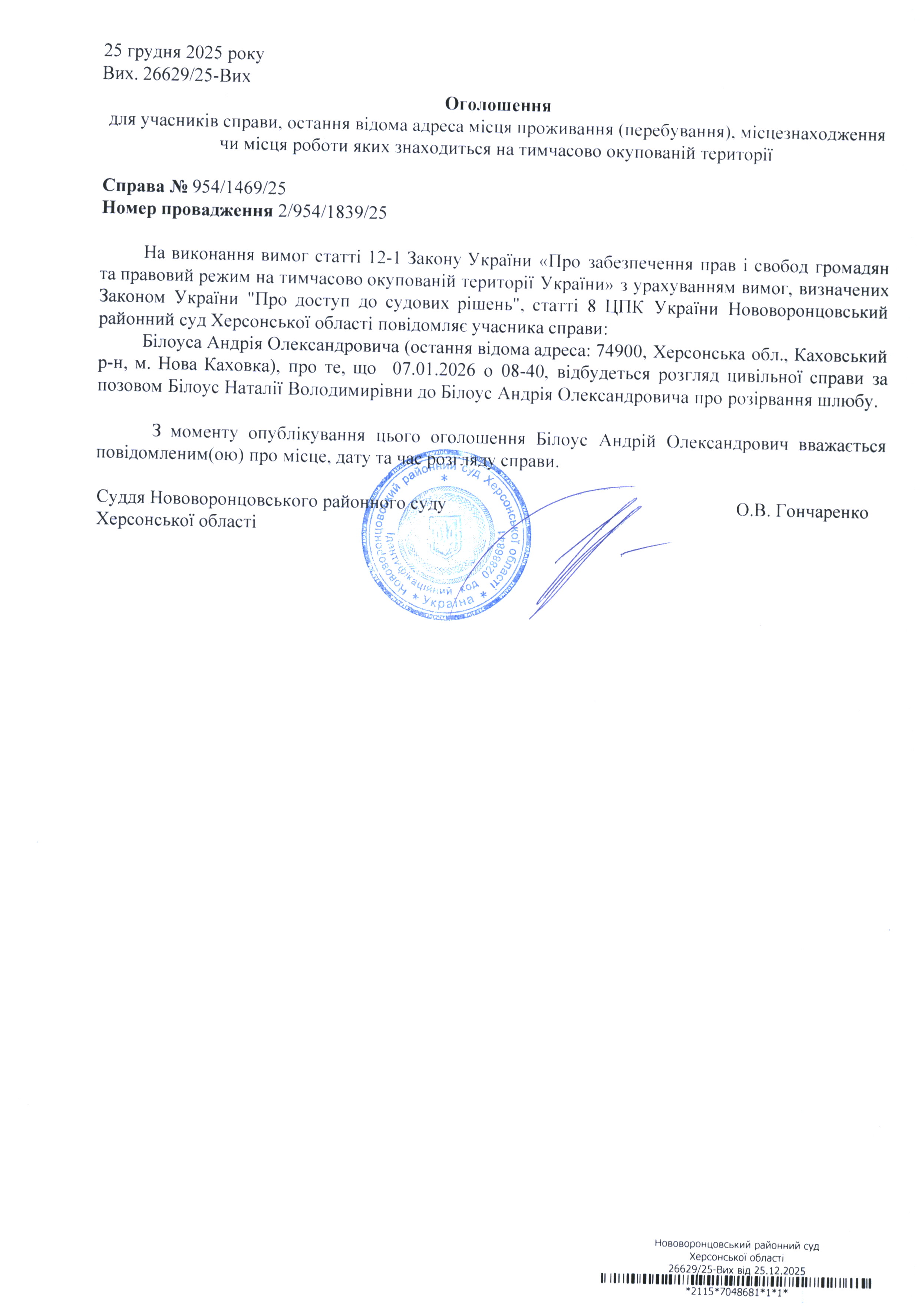 До суду викликається Білоус Андрій Олександрович на 8 год. 40 хв. 7 січня 2026 року