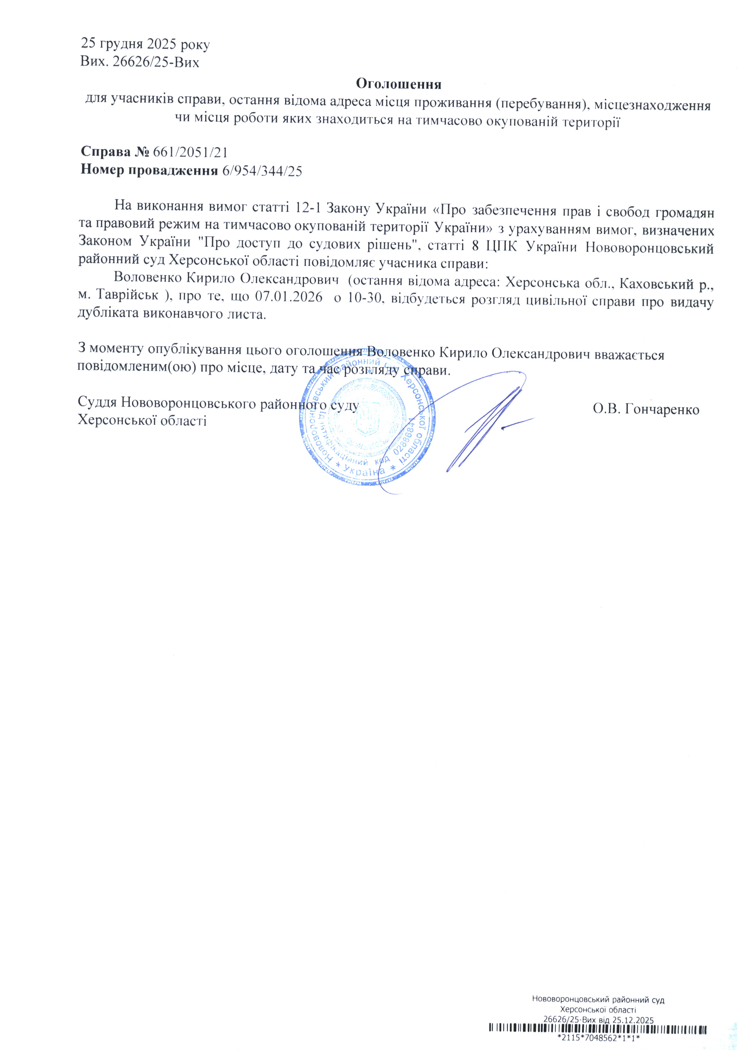 До суду викликається Воловенко Кирило Олександрович на 10 год. 30 хв. 7 січня 2026 року