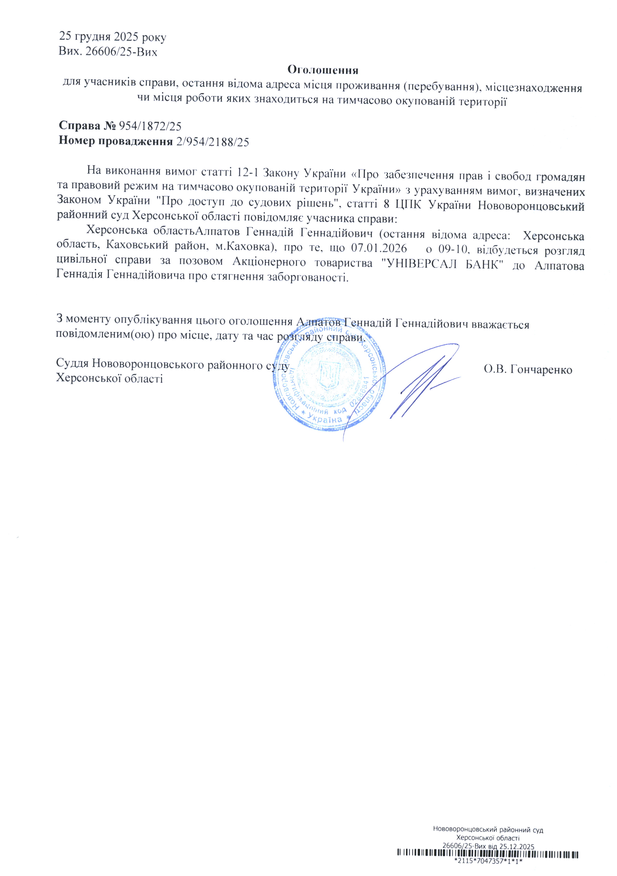 До суду викликається Алпатов Геннадій Геннадійович на 9 год. 10 хв. 7 січня 2026 року