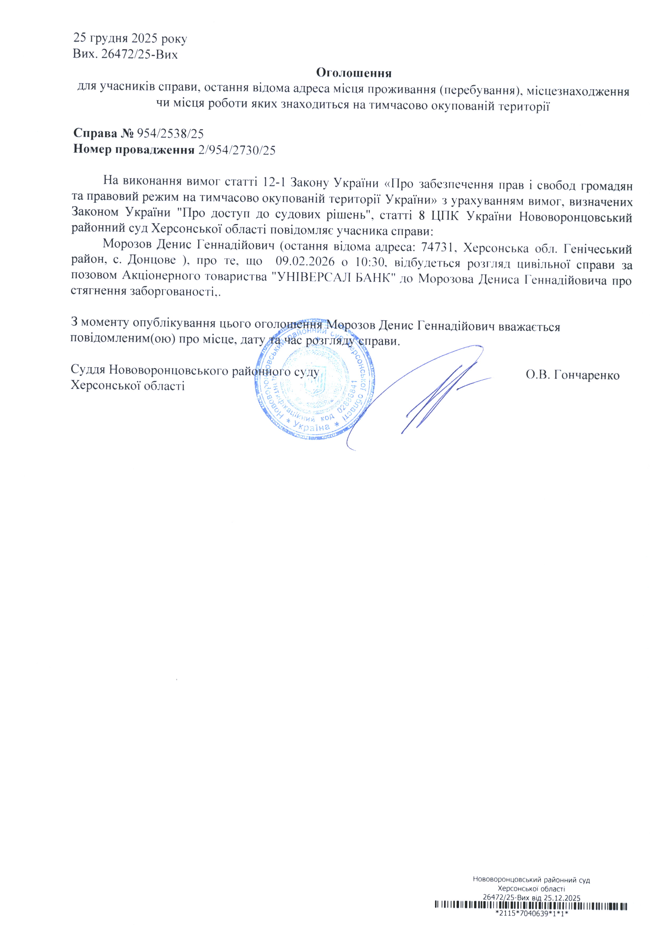 До суду викликається Морозов Денис Геннадійович на 10 год. 30 хв. 9 лютого 2026 року