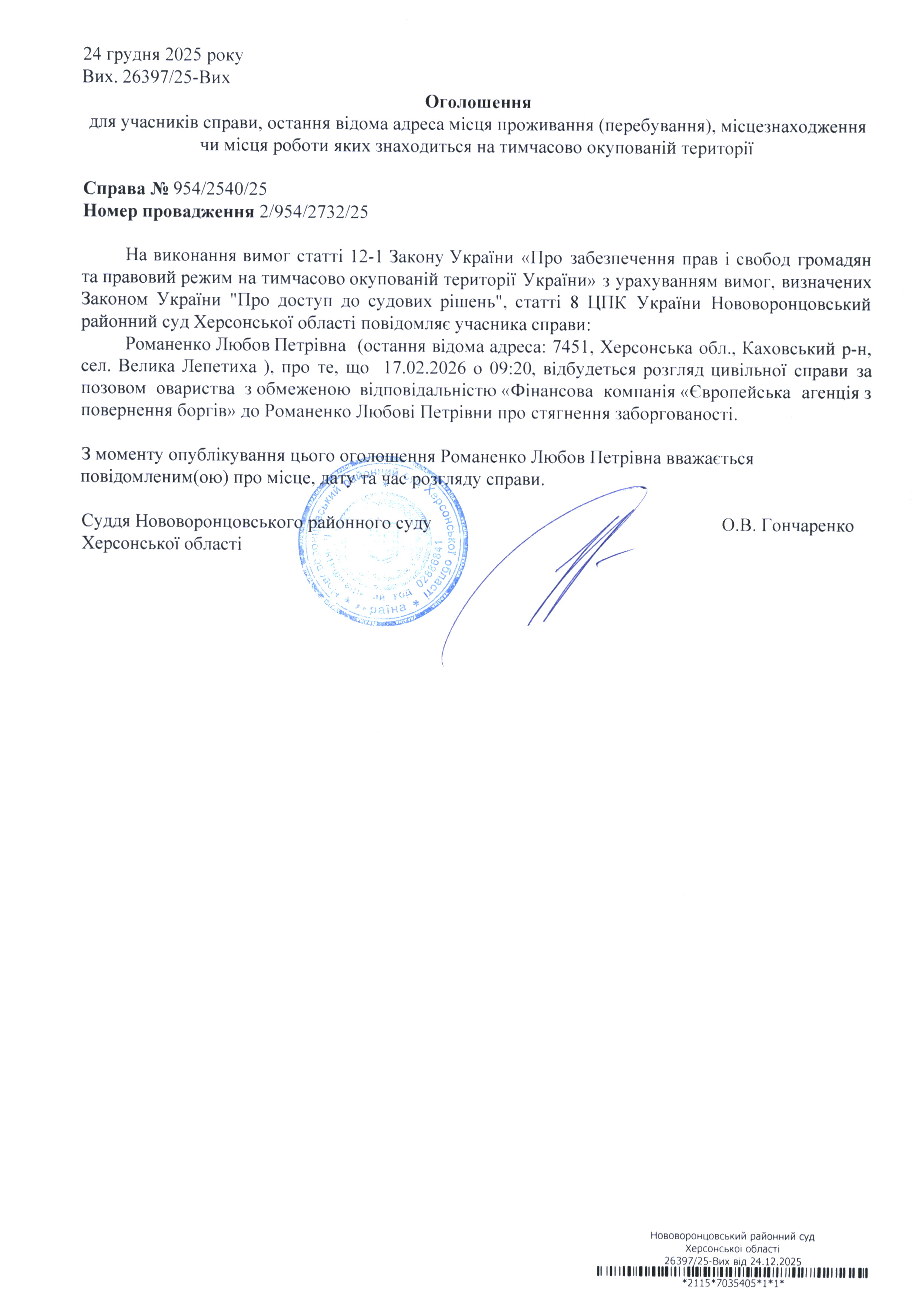 До суду викликається Романенко Любов Петрівна на 9 год. 20 хв. 17 лютого 2026 року