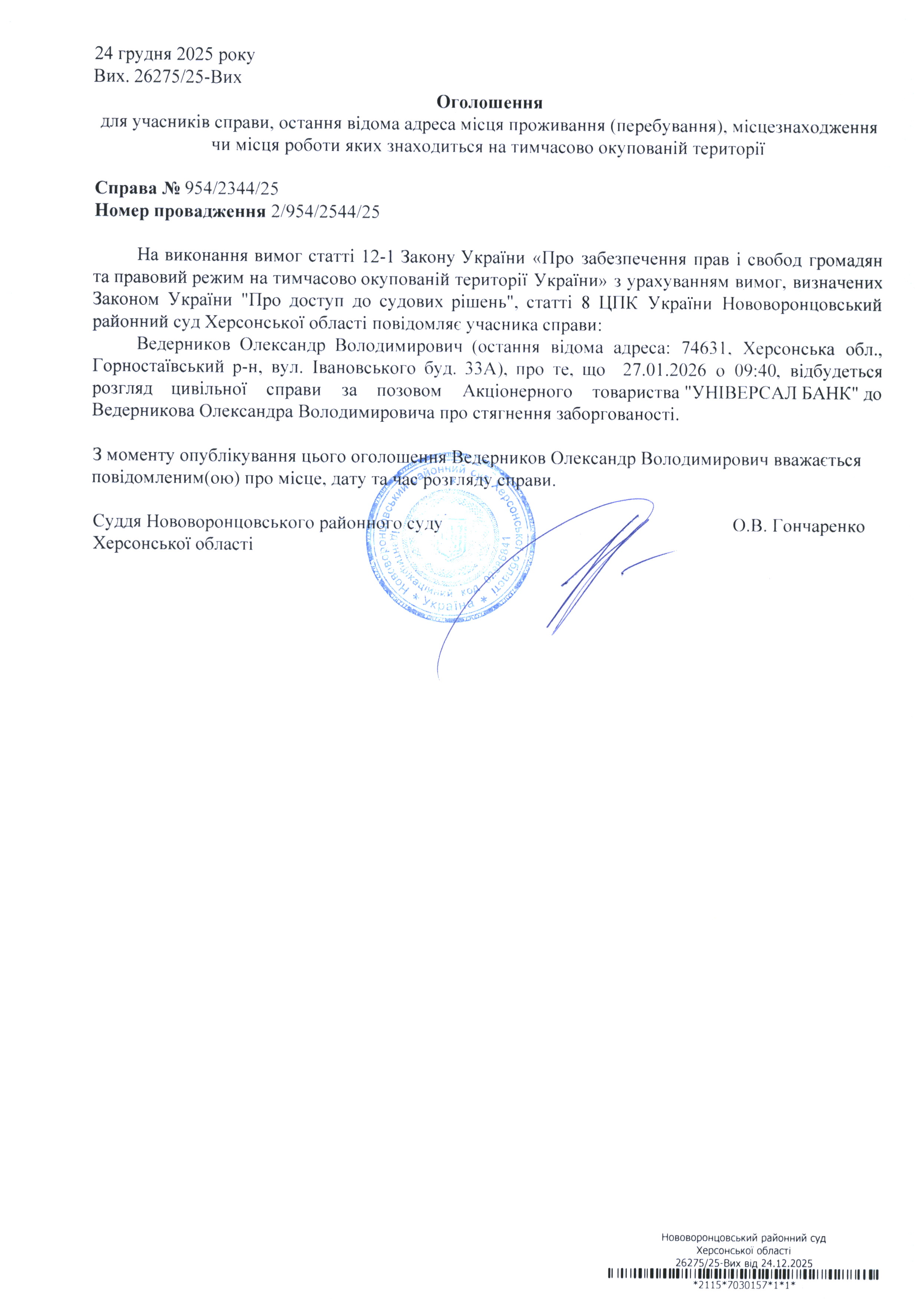 До суду викликається Ведерников Олександр Володимирович на 9 год. 40 хв. 27 січня 2026 року