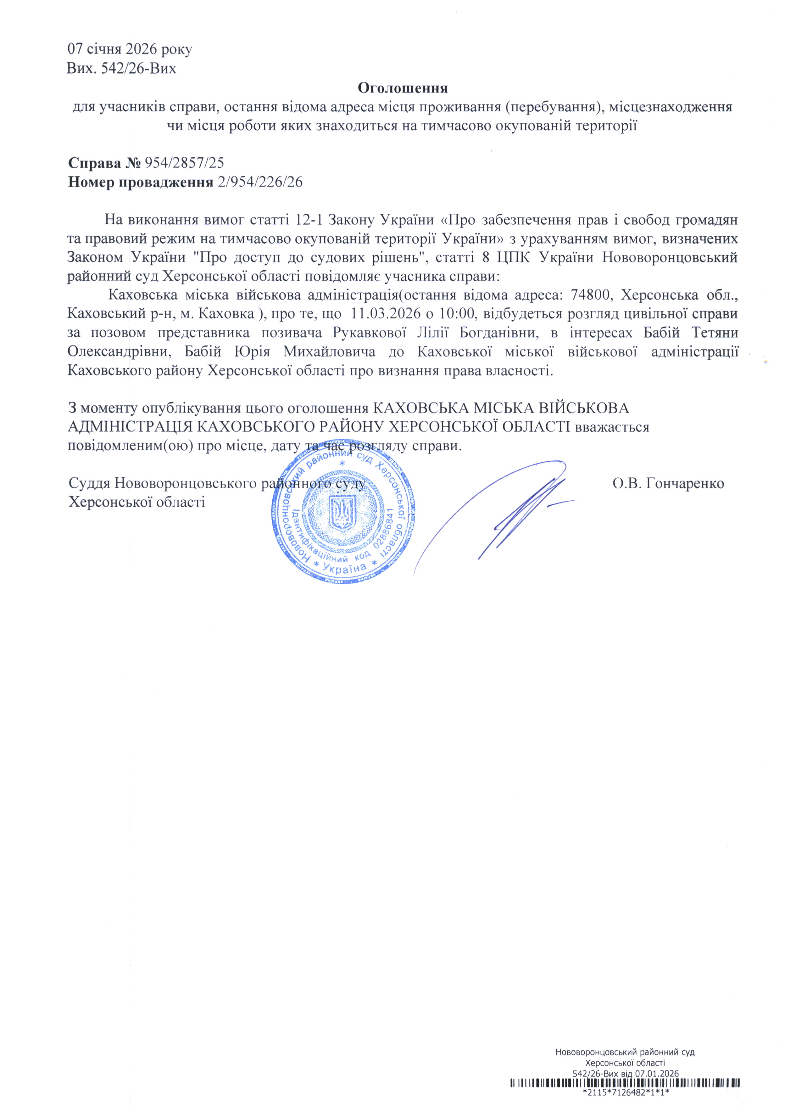 До суду викликається Каховська міська військова адміністрація на 10 год. 00 хв. 11 березня 2026 року