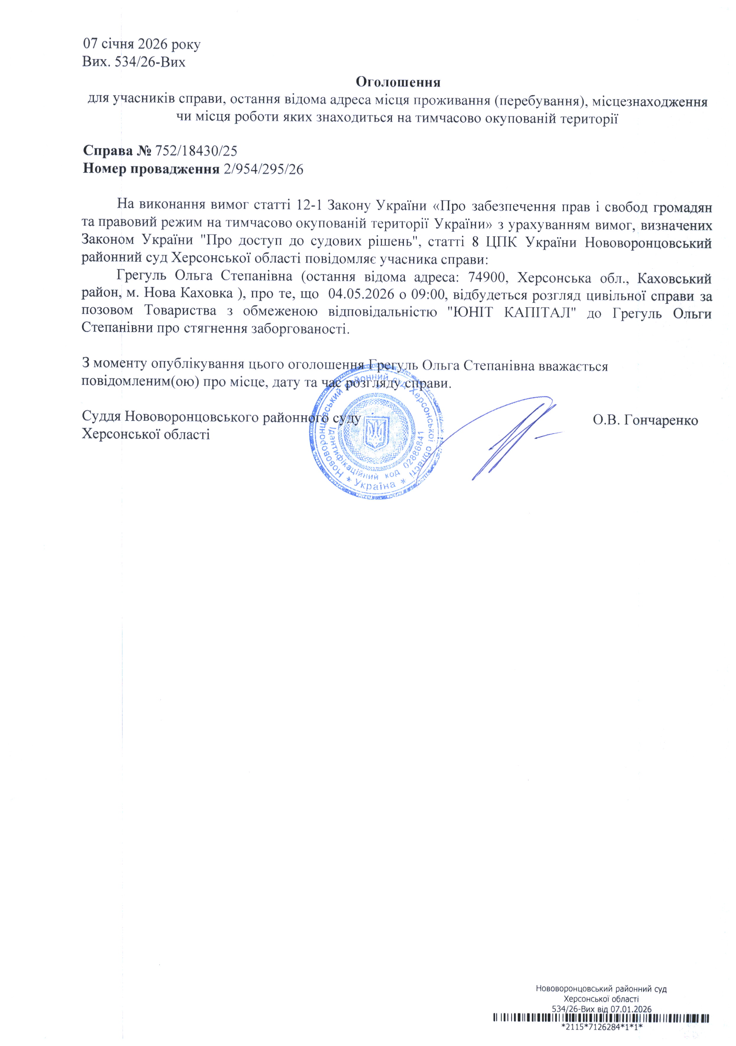 До суду викликається Грегуль Ольга Степанівна на 9 год. 00 хв. 4 травня 2026 року