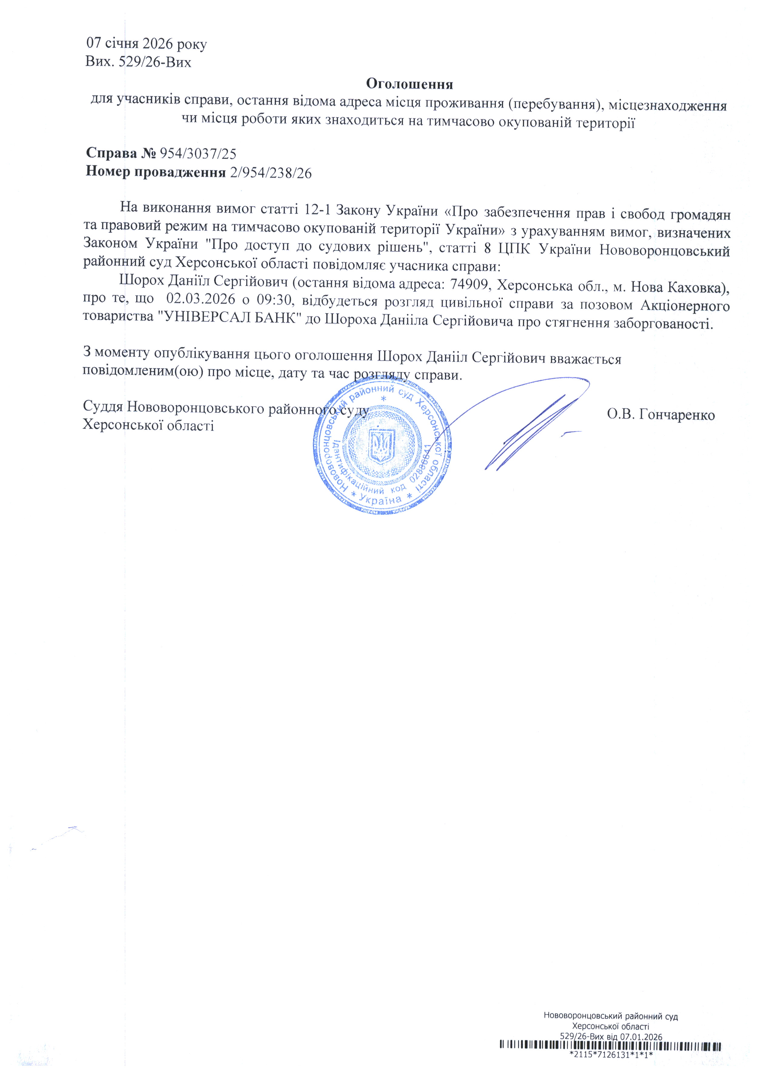 До суду викликається Шорох Даніїл Сергійович на 9 год. 30 хв. 2 березня 2026 року