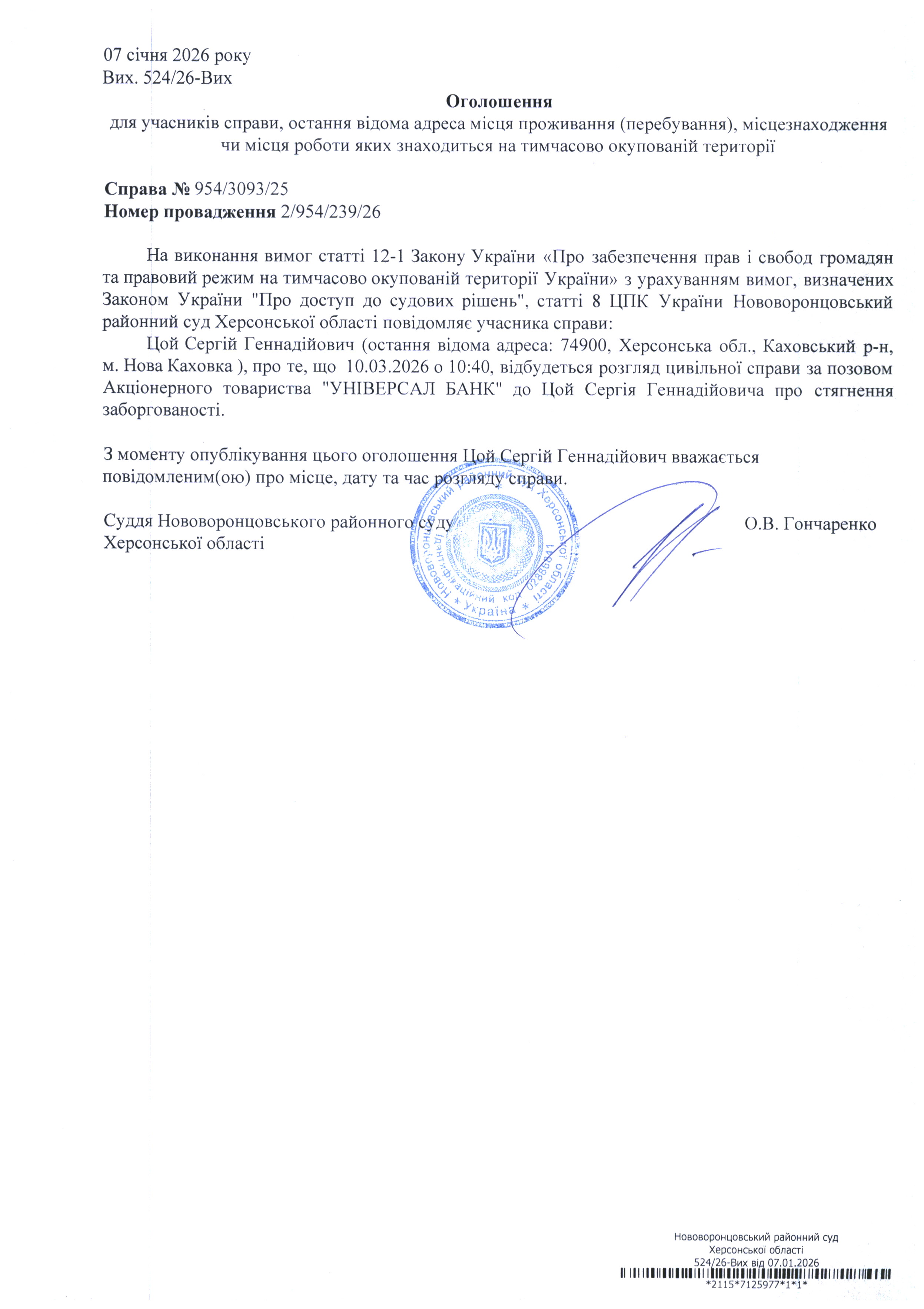 До суду викликається Цой Сергій Геннадійович на 10 год. 40 хв. 10 березня 2026 року