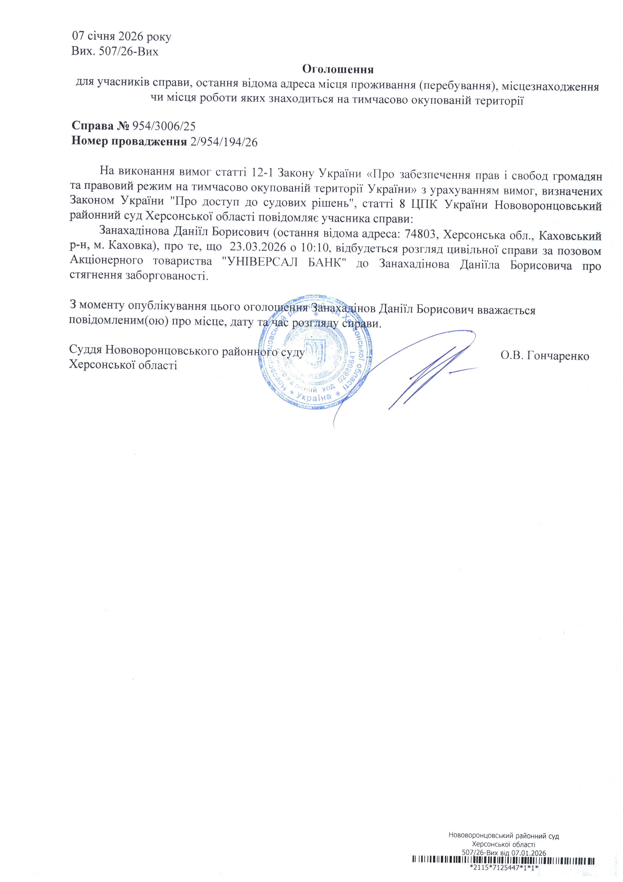 До суду викликається Занахадінов Даніїл Борисович на 10 год. 10 хв. 23 березня 2026 року