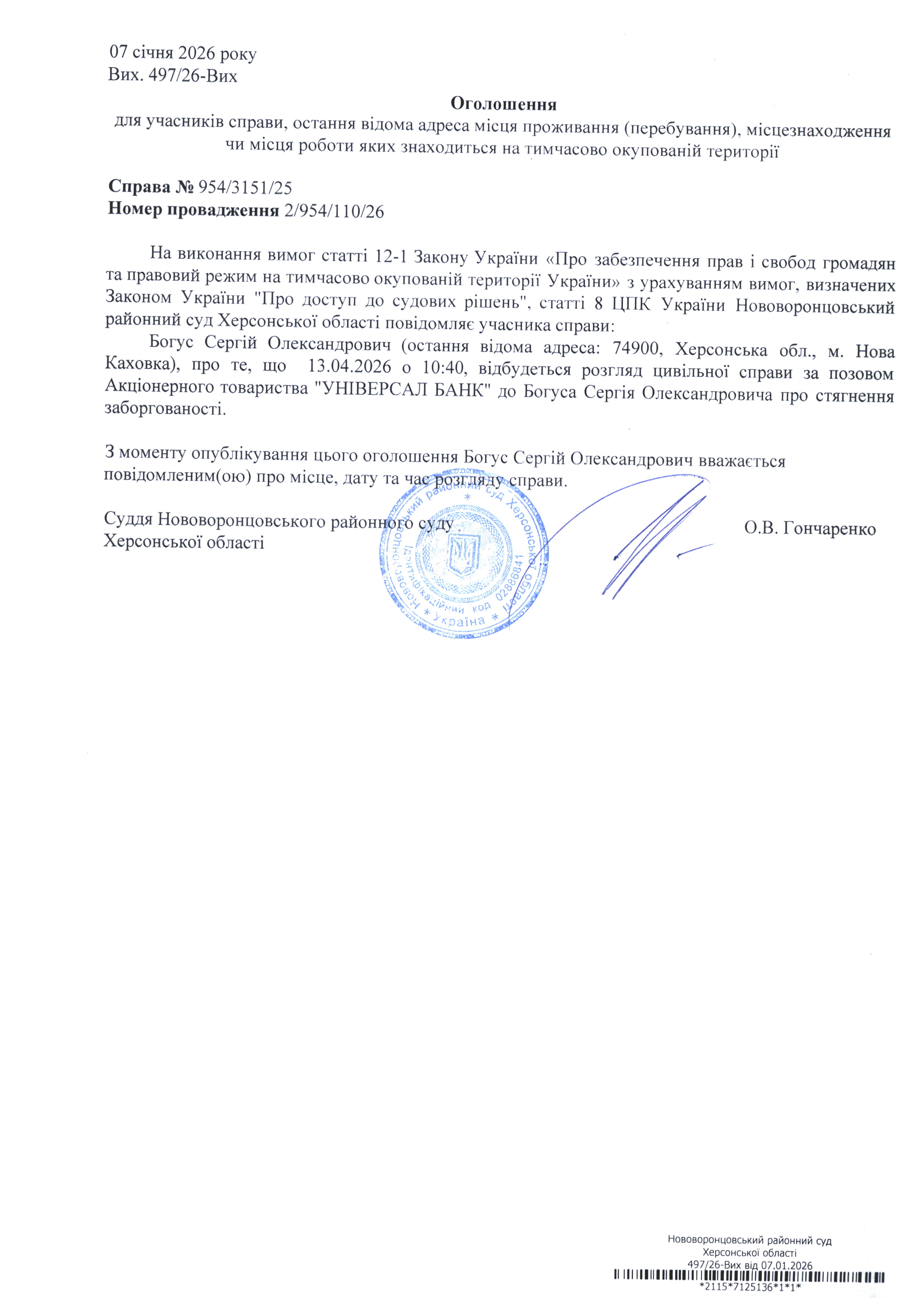 До суду викликається Богус Сергій Олександрович на 10 год. 40 хв. 13 квітня 2026 року