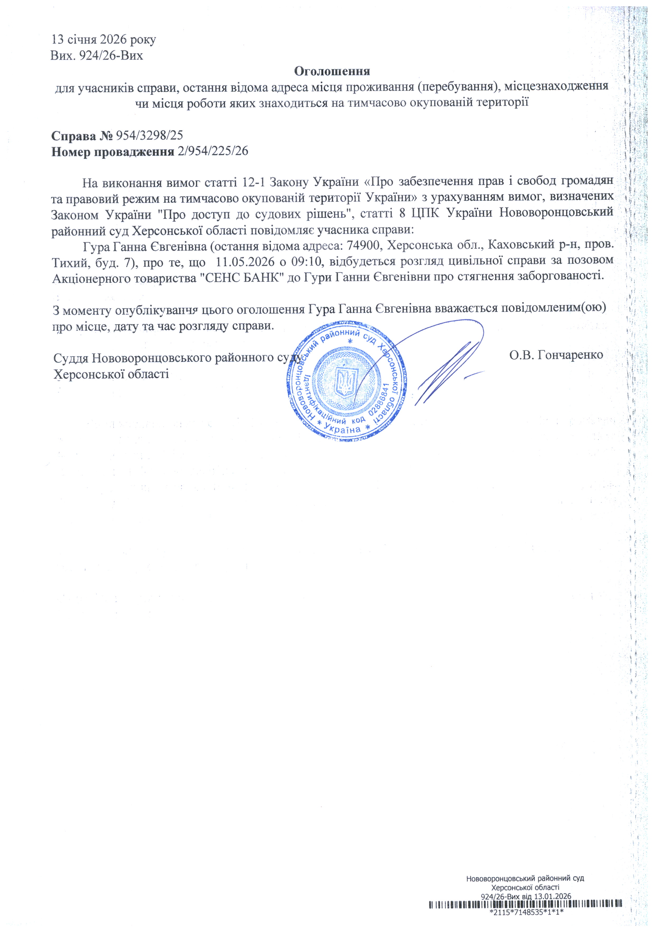 До суду викликається Гура Ганна Євгенівна на 9 год. 10 хв. 11 травня 2026 року