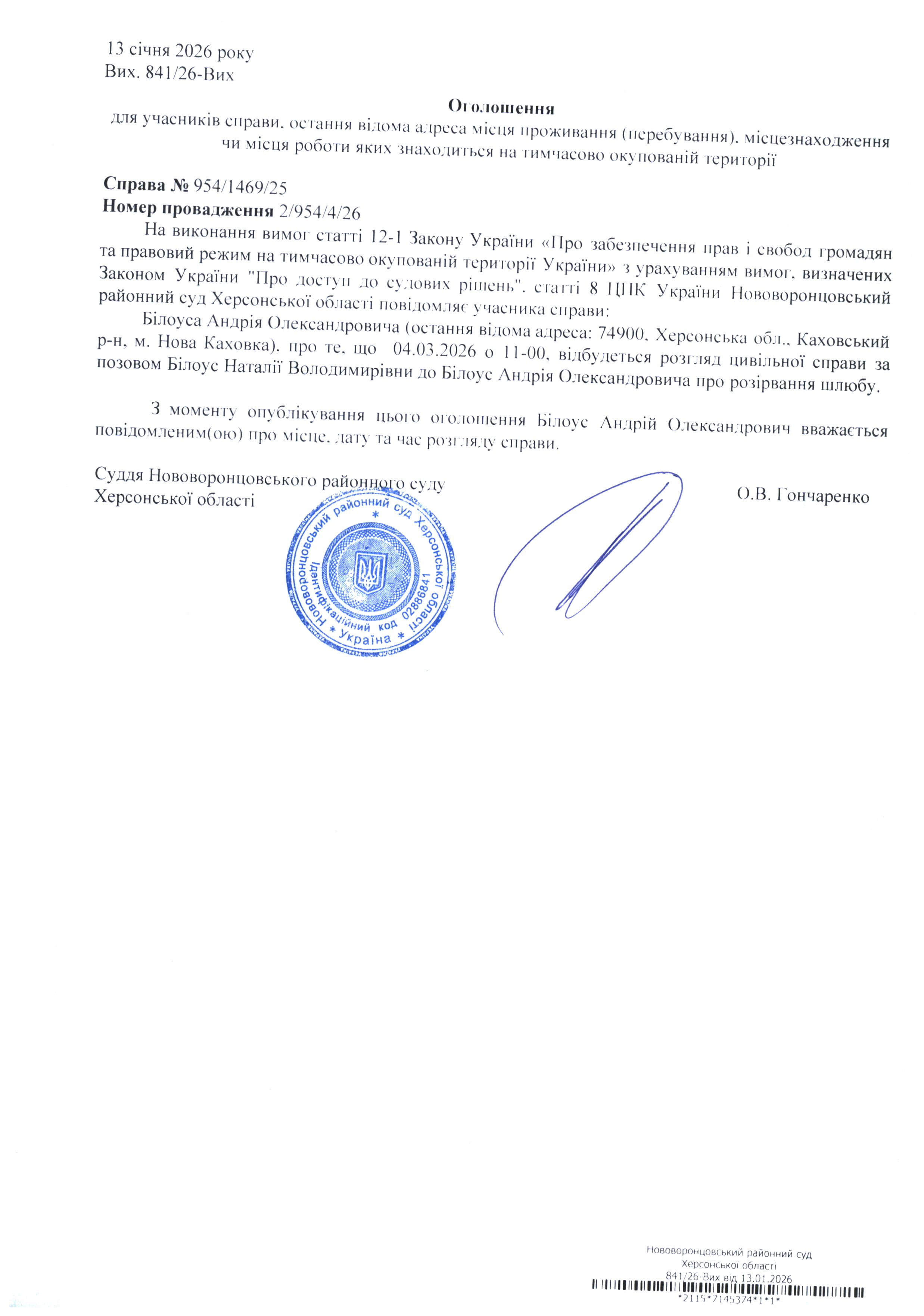 До суду викликається Білоус Андрій Олександрович на 11 год. 00 хв. 4 березня 2026 року
