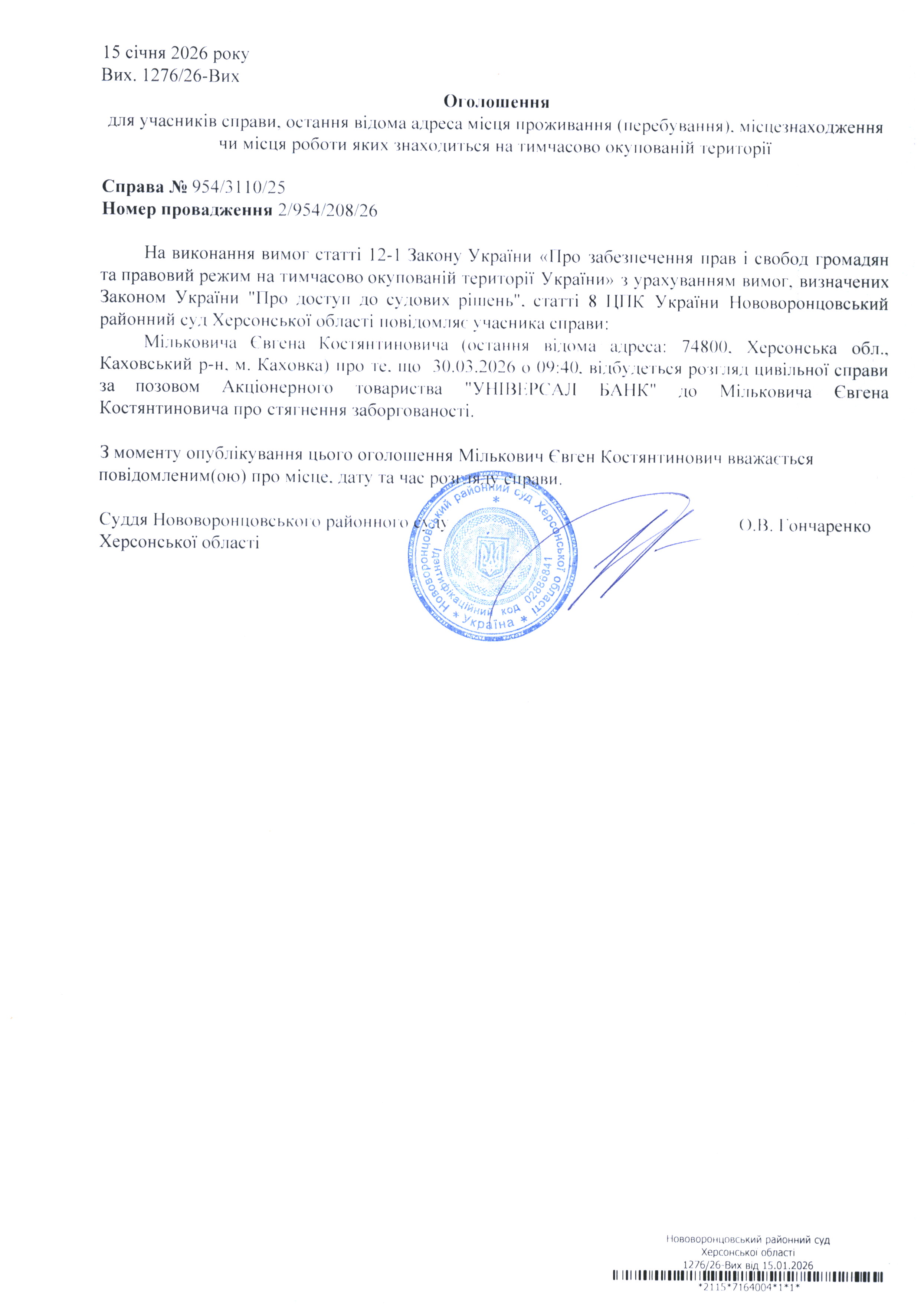 До суду викликається Мількович Євген Костянтинович на 9 год. 40 хв. 30 березня 2026 року