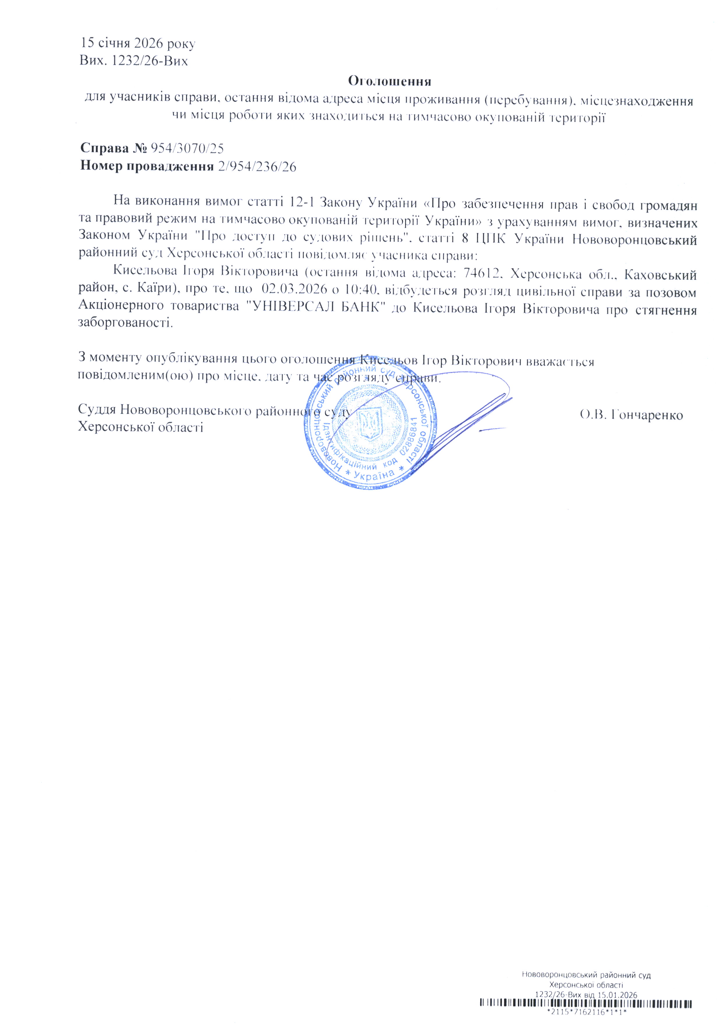 До суду викликається Кисельов Ігор Вікторович на 10 год. 40 хв. 2 березня 2026 року
