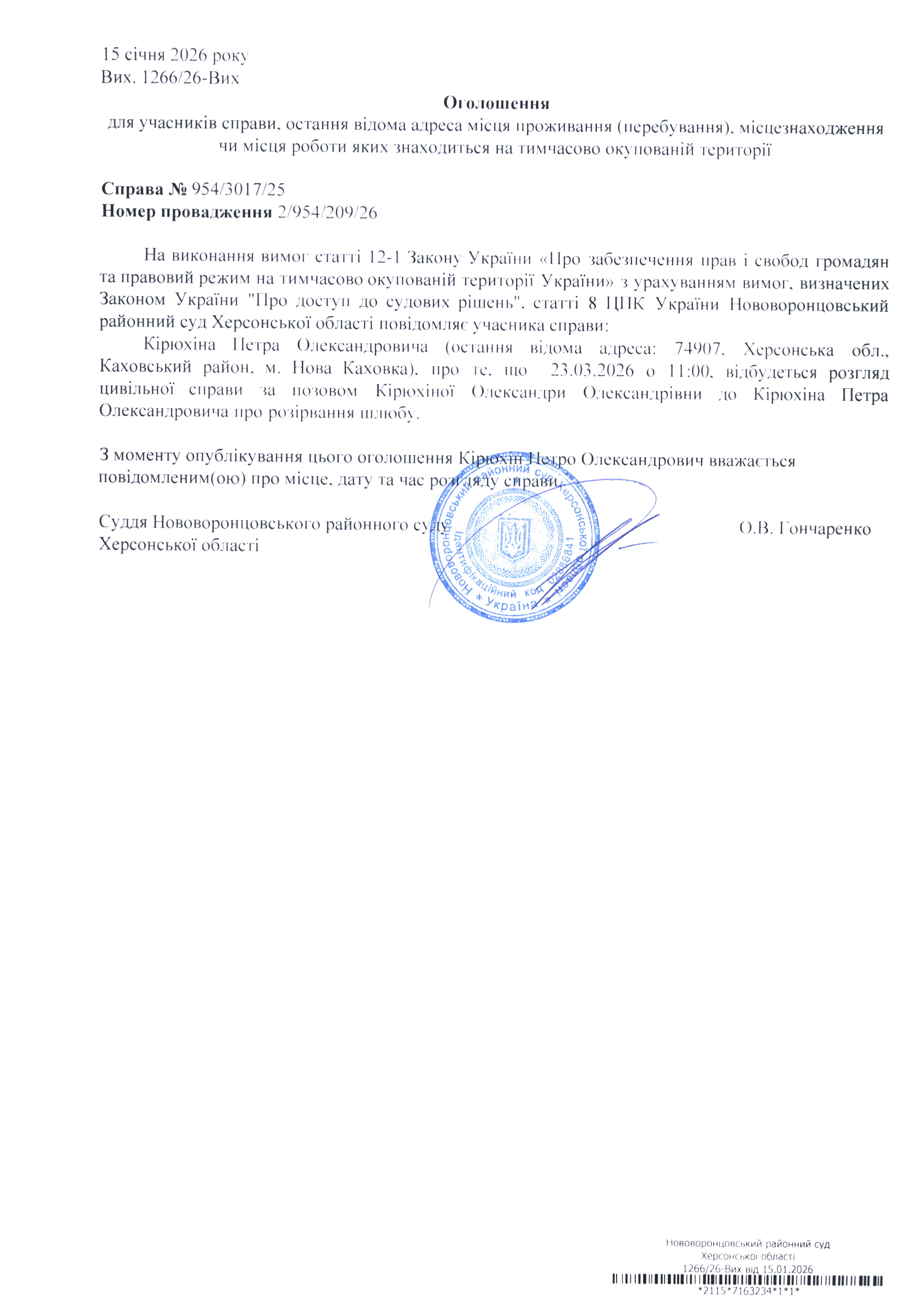 До суду викликається Кірюхін Петро Олександрович на 11 год. 00 хв. 23 березня 2026 року