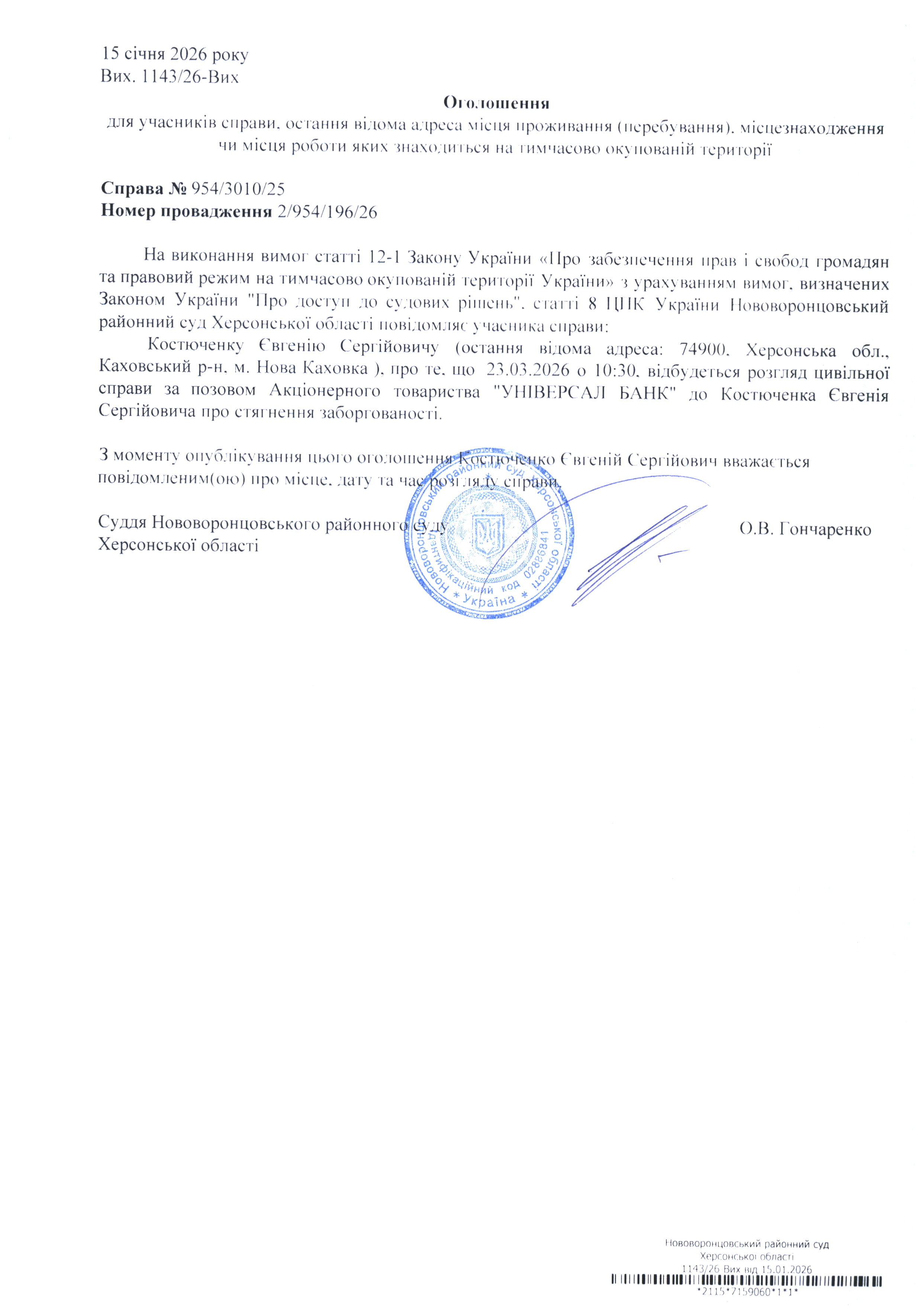 До суду викликається Костюченко Євгеній Сергійович на 10 год. 30 хв. 23 березня 2026 року