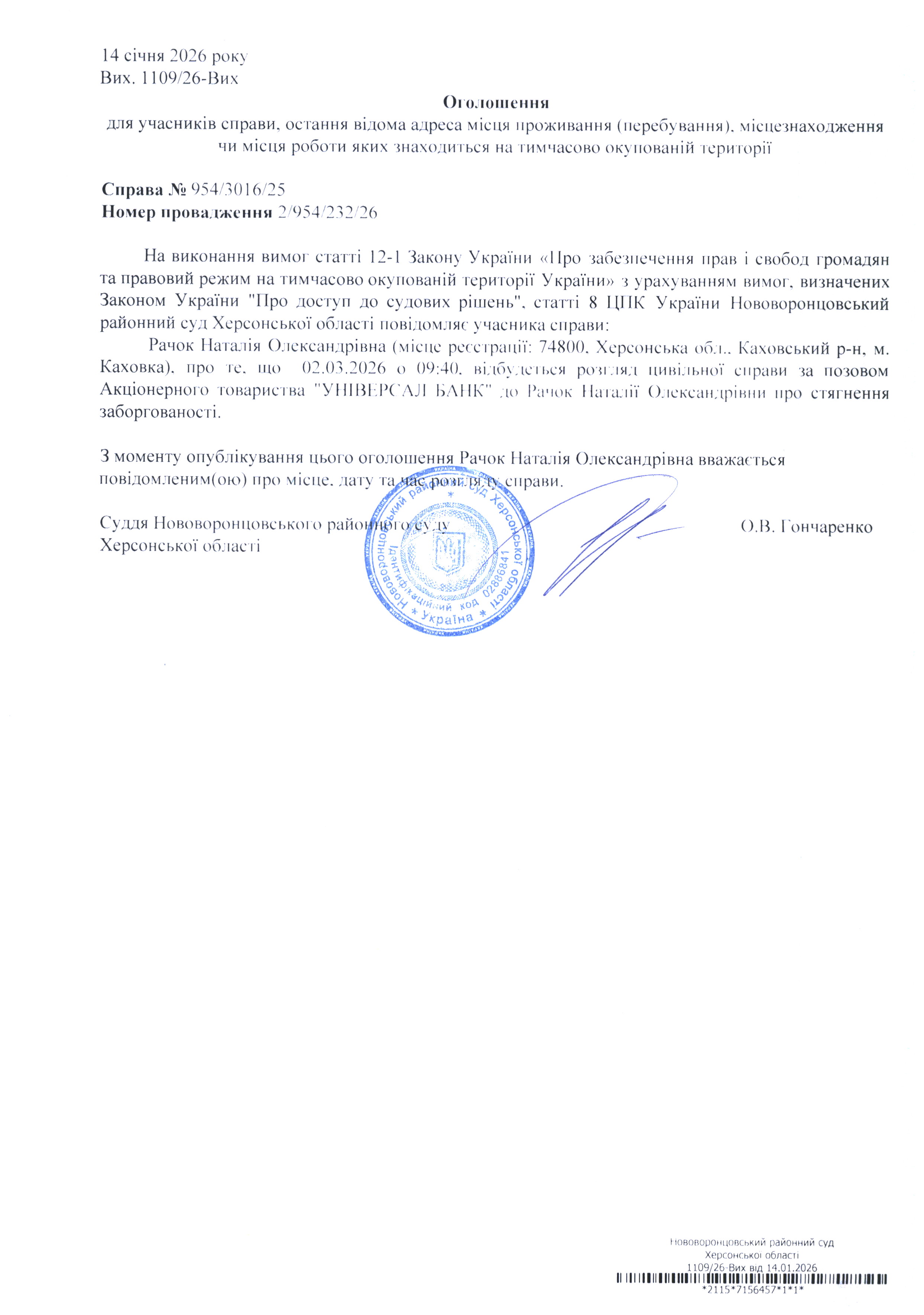 До суду викликається Рачок Наталія Олександрівна на 9 год. 40 хв. 2 березня 2026 року