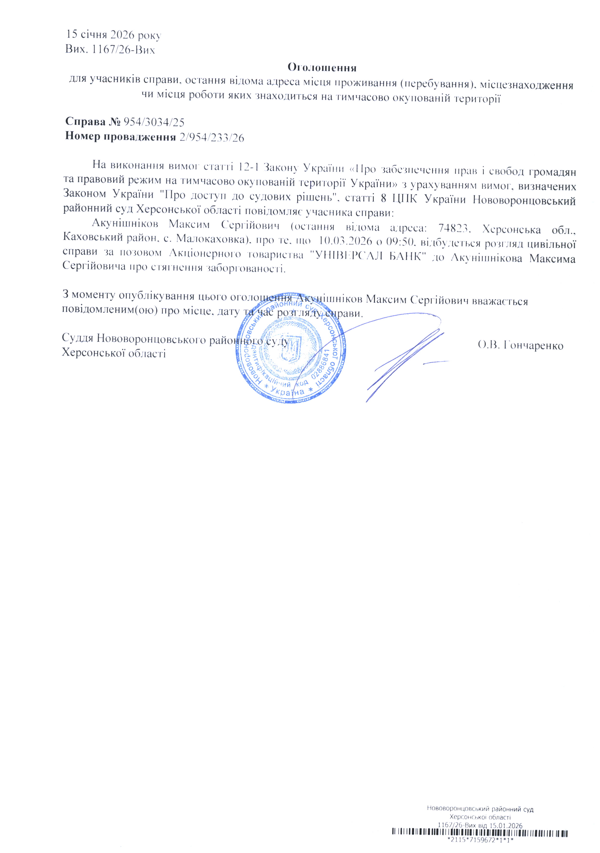 До суду викликається Акунішніков Максим Сергійович на 9 год. 50 хв. 10 березня 2026 року